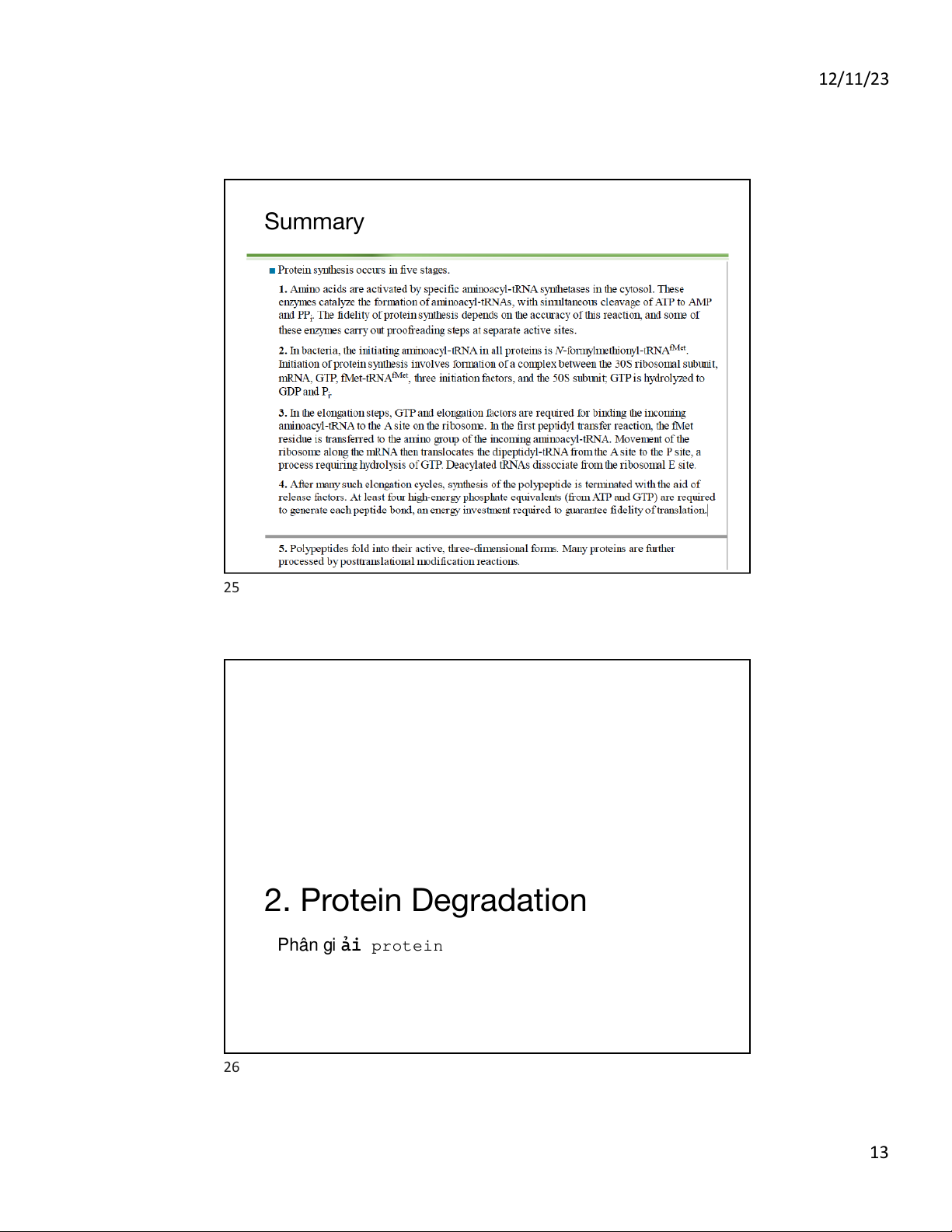 Kết t húc khi hì nh t hành l i ên k t ế pept i de 22 11 12/11/23 Elongation 23 Termination Dừng 24 12 12/11/23 Summary 25 2. Protein Degradation Phân gi ải protein 26 13 12/11/23 27 Digestion of Dietary Protein