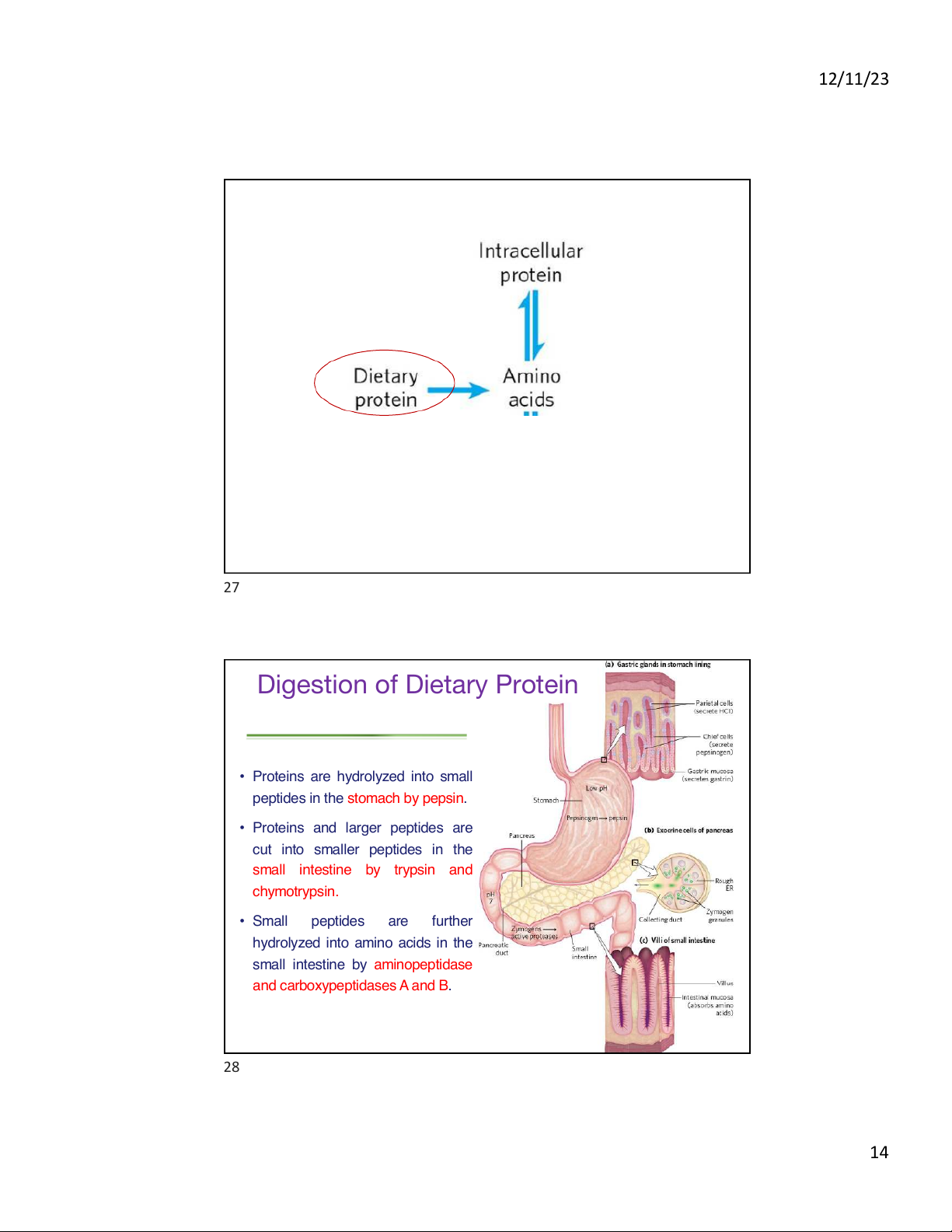 small intestine by aminopeptidase and carboxypeptidases A and B. 28 14 12/11/23 Digestion of Dietary Protein