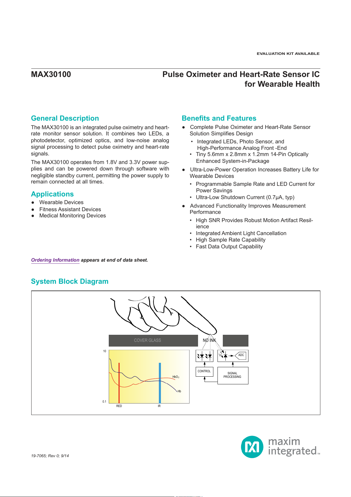 Ordering Information appears at end of data sheet. System Block Diagram COVER GLASS NO INK 10 ADC CONTROL SIGNAL HbO 2 PROCESSING Hb 0.1 RED IR 19-7065; Rev 0; 9/14 MAX30100