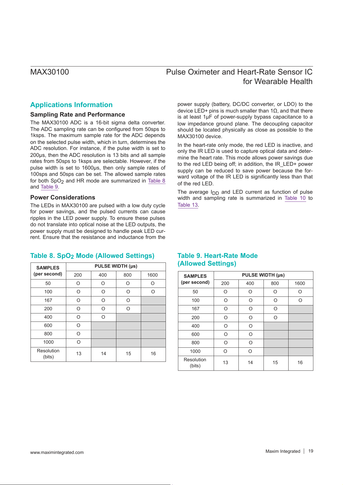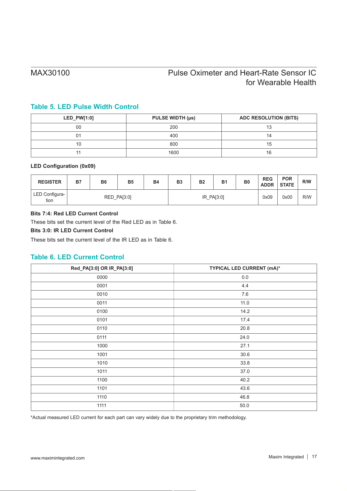 Table 5. LED Pulse Width Control LED_PW[1:0] PULSE WIDTH (µs) ADC RESOLUTION (BITS) 00 200 13 01 400 14 10 800 15 11 1600 16 LED Configuration (0x09) REG POR REGISTER B7 B6 B5 B4 B3 B2 B1 B0 R/W ADDR STATE LEDConfigura- RED_PA[3:0] IR_PA[3:0] 0x09 0x00 R/W tion