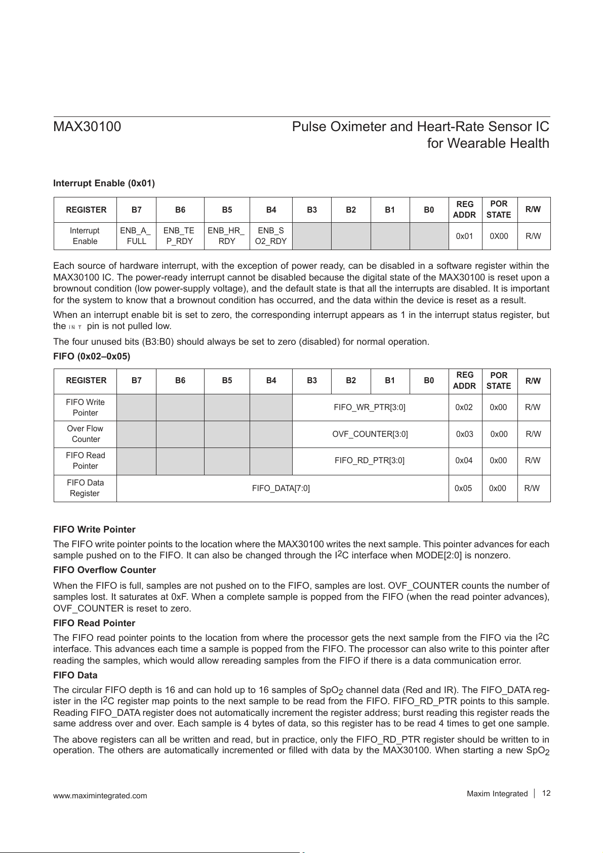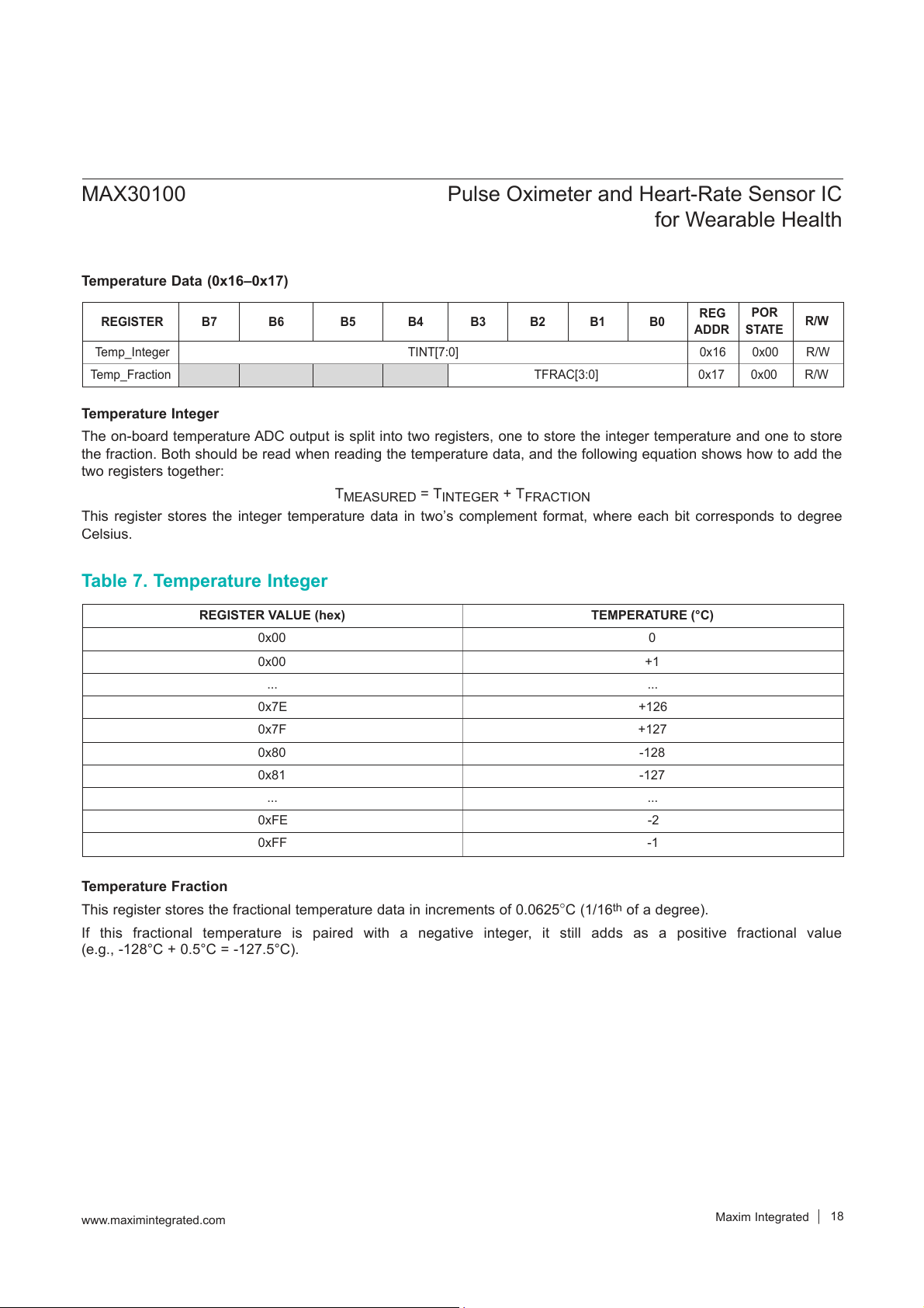Pulse Oximeter and Heart-Rate Sensor IC for Wearable Health Temperature Data (0x16–0x17) REG POR REGISTER B7 B6 B5 B4 B3 B2 B1 B0 R/W ADDR STATE Temp_Integer TINT[7:0] 0x16 0x00 R/W Temp_Fraction TFRAC[3:0] 0x17 0x00 R/W Temperature Integer