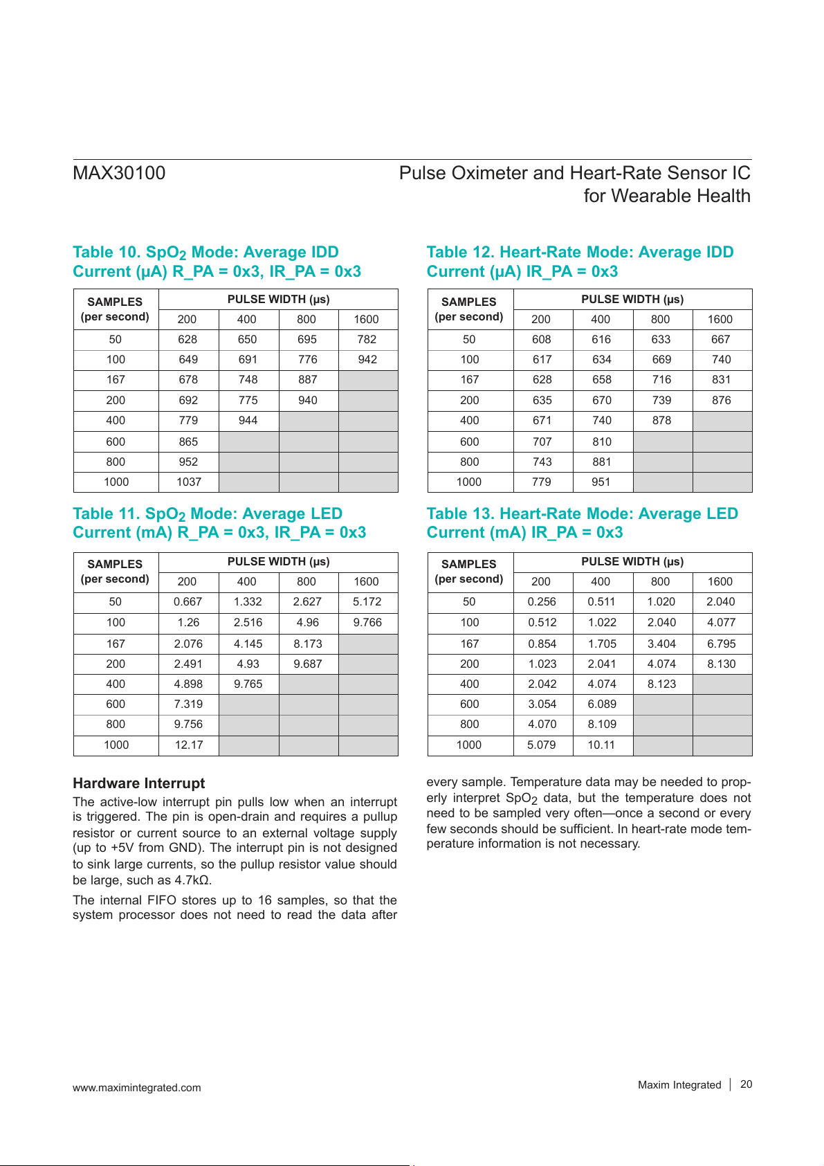 Current (mA) R_PA = 0x3, IR_PA = 0x3 Current (mA) IR_PA = 0x3 SAMPLES PULSE WIDTH (µs) SAMPLES PULSE WIDTH (µs) (per second) (per second) 200 400 800 1600 200 400 800 1600 50 0.667 1.332 2.627 5.172 50 0.256 0.511 1.020 2.040 100 1.26 2.516 4.96 9.766 100 0.512 1.022 2.040 4.077 167 2.076 4.145 8.173 167 0.854 1.705 3.404 6.795 200 2.491 4.93 9.687 200 1.023 2.041 4.074 8.130 400 4.898 9.765 400 2.042 4.074 8.123 600 7.319 600 3.054 6.089 800 9.756 800 4.070 8.109 1000 12.17 1000 5.079 10.11 Hardware Interrupt
