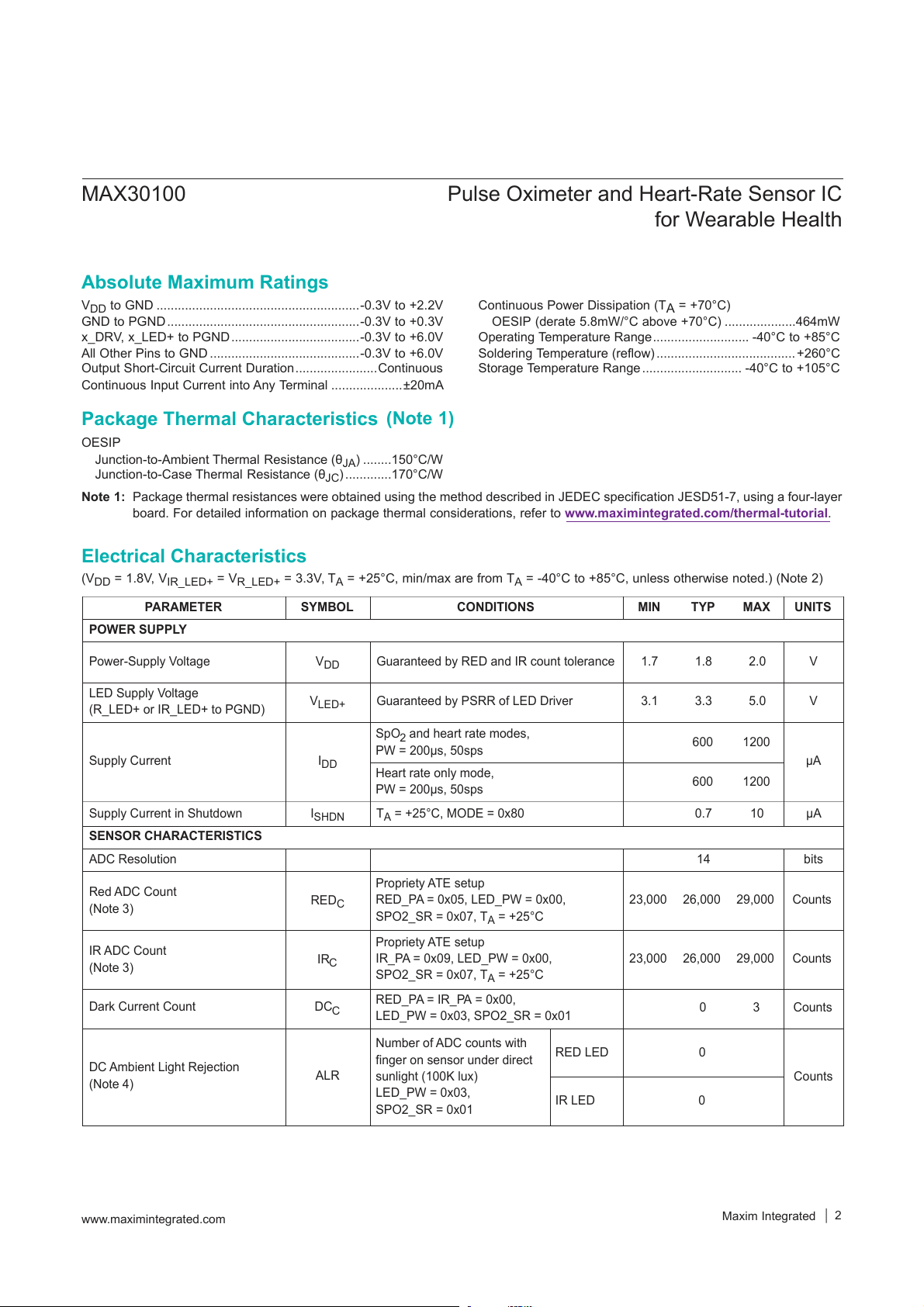 fingeronsensorunderdirect RED LED 0 DC Ambient Light Rejection ALR sunlight (100K lux) Counts (Note 4) LED_PW = 0x03, IR LED 0 SPO2_SR = 0x01 www.maximintegrated.com Maxim Integrated │ 2 MAX30100