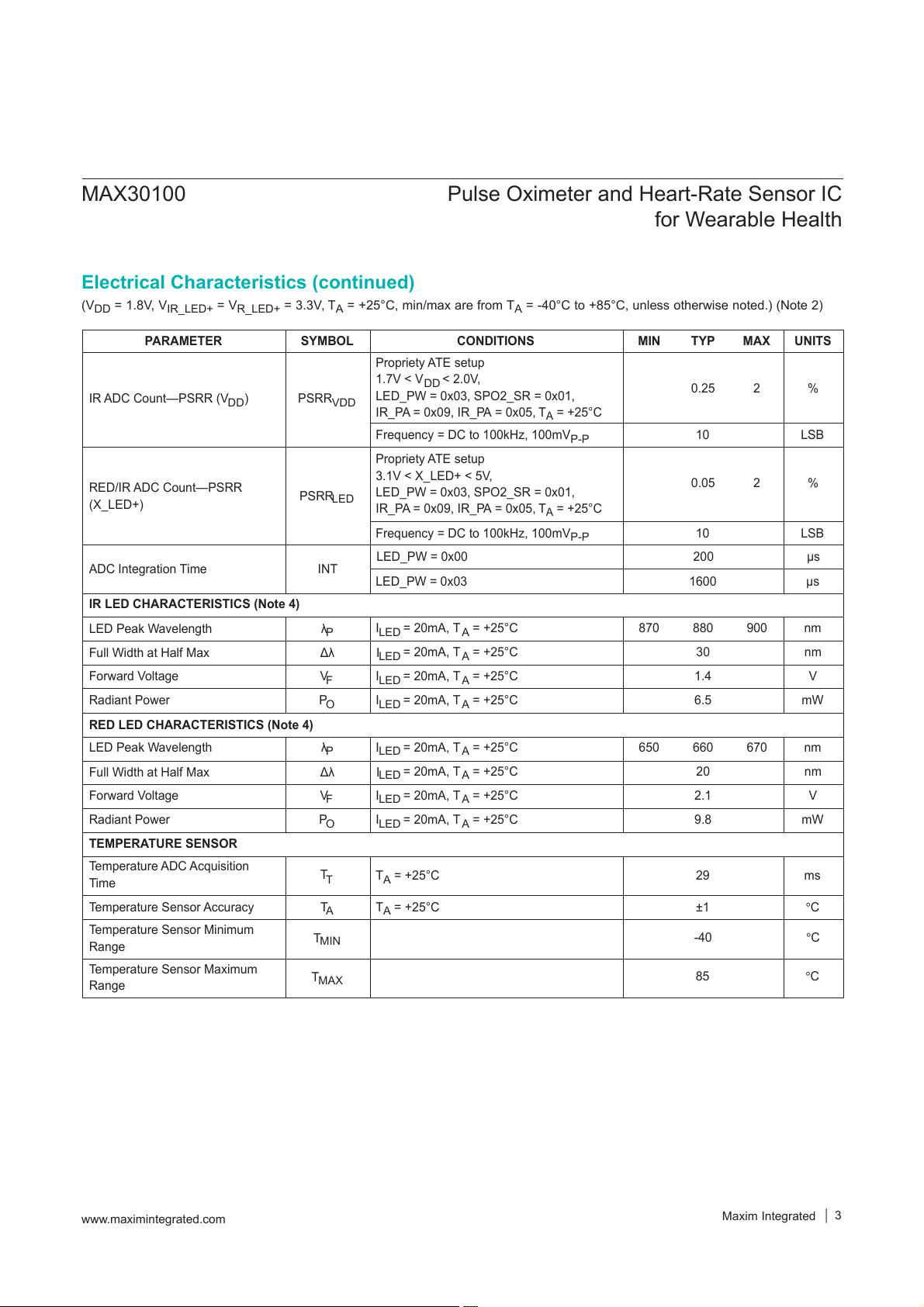 RED LED CHARACTERISTICS (Note 4) LED Peak Wavelength λP ILED = 20mA, TA = +25°C 650 660 670 nm Full Width at Half Max Δλ ILED = 20mA, TA = +25°C 20 nm Forward Voltage VF ILED = 20mA, TA = +25°C 2.1 V Radiant Power PO ILED = 20mA, TA = +25°C 9.8 mW TEMPERATURE SENSOR Temperature ADC Acquisition T Time T TA = +25°C 29 ms Temperature Sensor Accuracy TA TA = +25°C ±1 °C Temperature Sensor Minimum T Range MIN -40 °C Temperature Sensor Maximum T Range MAX 85 °C www.maximintegrated.com Maxim Integrated │ 3 MAX30100