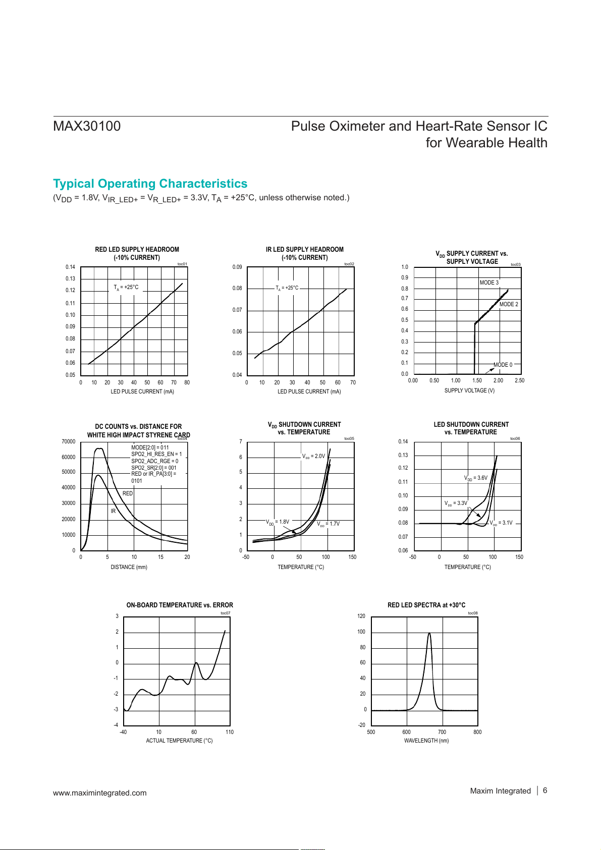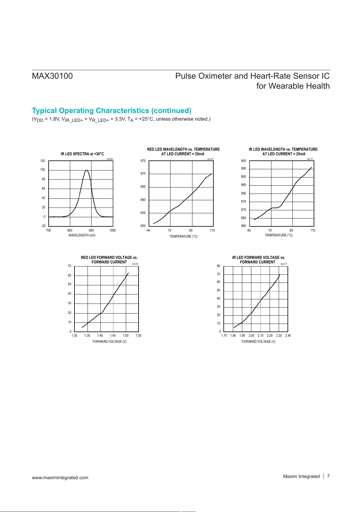 RED LED SPECTRA at +30°C toc07 toc08 3 120 2 100 (°C) 1 (%) 80 0 60 ERROR POWER -1 TURE 40 -2 NORMALIZE 20 TEMPERA -3 0 -4 -20 -40 10 60 110 500 600 700 800 ACTUAL TEMPERATURE (°C) WAVELENGTH (nm) Maxim Integrated │ 6 www.maximintegrated.com MAX30100