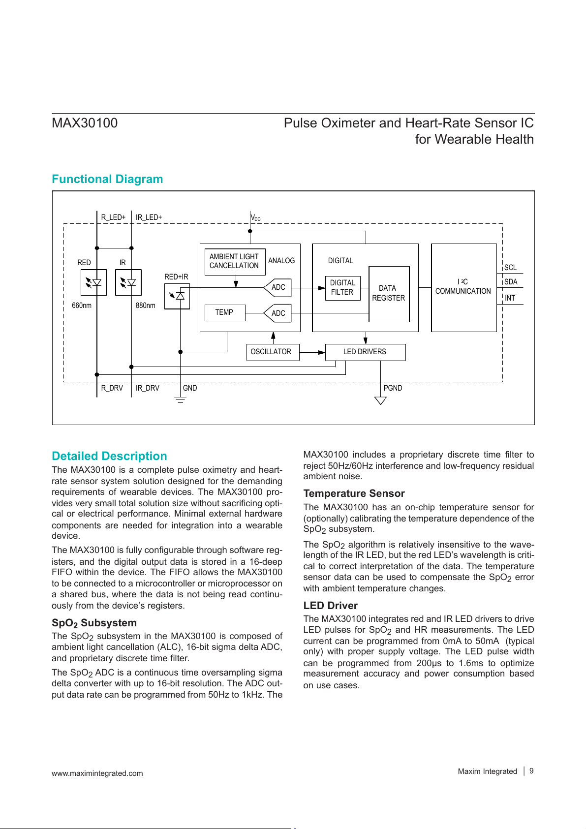 Pulse Oximeter and Heart-Rate Sensor IC for Wearable Health Functional Diagram R_LED+ IR_LED+ VDD AMBIENT LIGHT ANALOG DIGITAL RED IR CANCELLATION SCL RED+IR DIGITAL I 2C SDA ADC DATA FILTER COMMUNICATION REGISTER INT 660nm 880nm TEMP ADC OSCILLATOR LED DRIVERS R_DRV IR_DRV GND PGND Detailed Description