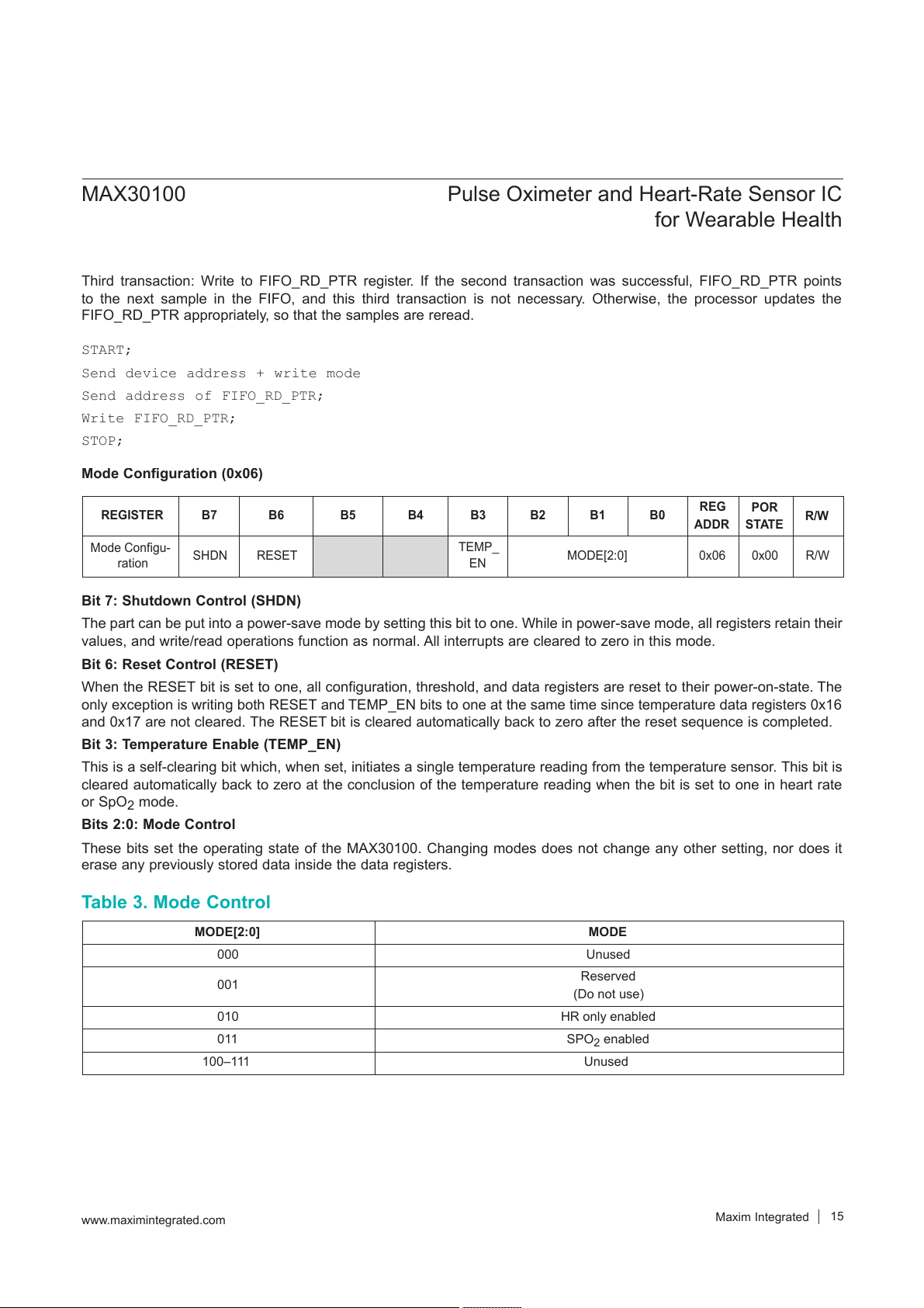erase any previously stored data inside the data registers. Table 3. Mode Control MODE[2:0] MODE 000 Unused Reserved 001 (Do not use) 010 HR only enabled 011 SPO2 enabled 100–111 Unused www.maximintegrated.com