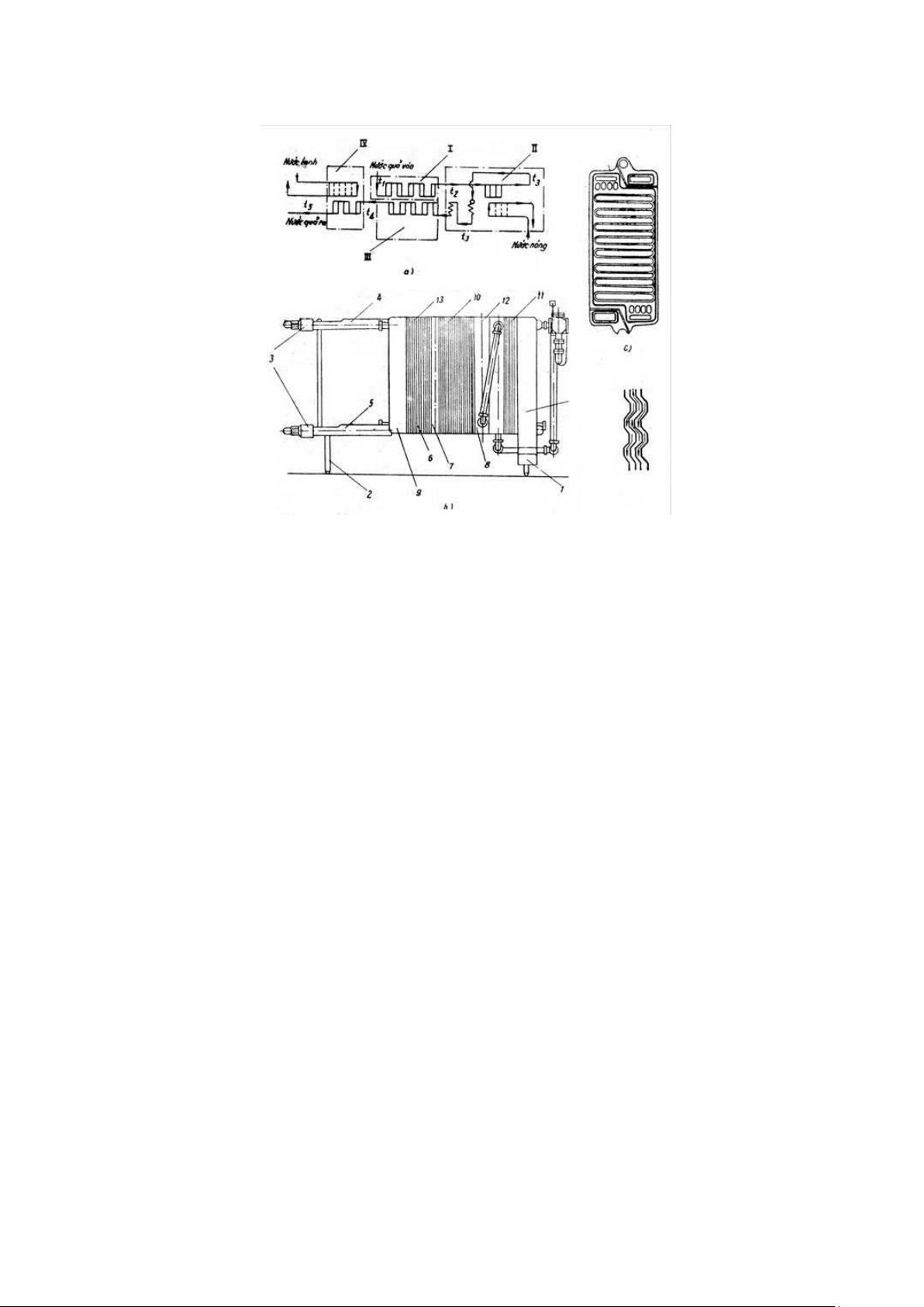a) thiết bị thanh trùng; b) bản mỏng lượn sóng; c) sơ đồ làm việc