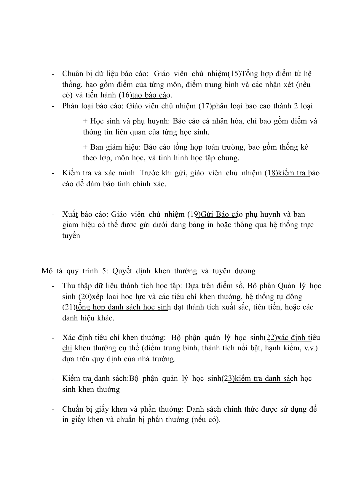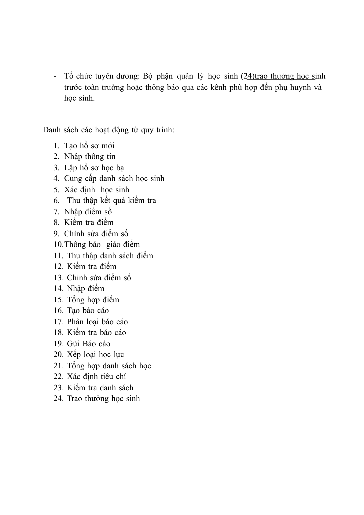 11. Thu thập danh sách điểm 12. Kiểm tra điểm 13. Chỉnh sửa điểm số 14. Nhập điểm 15. Tổng hợp điểm 16. Tạo báo cáo 17. Phân loại báo cáo 18. Kiểm tra báo cáo 19. Gửi Báo cáo 20. Xếp loại học lực
