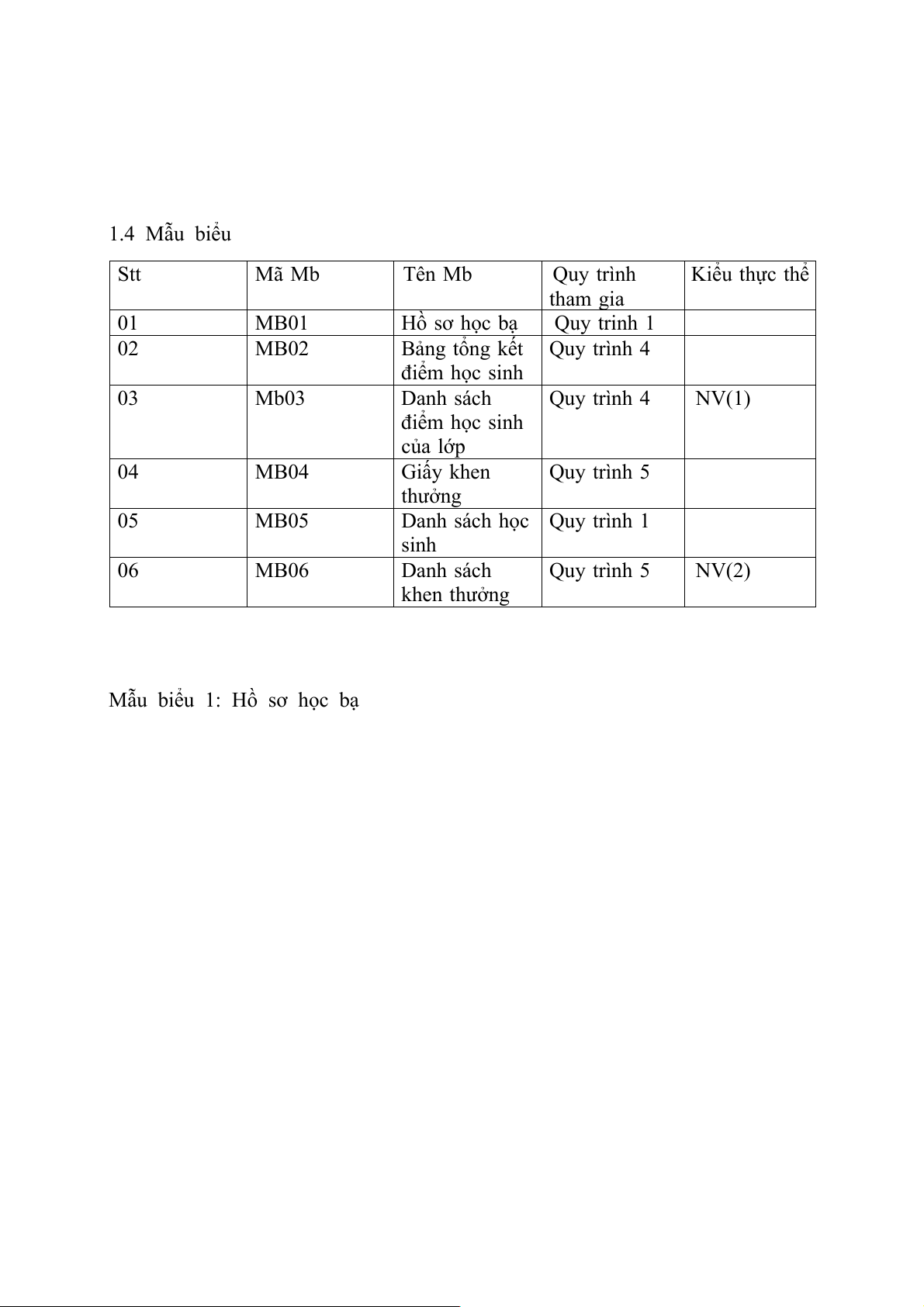21. Tổng hợp danh sách học 22. Xác định tiêu chí 23. Kiểm tra danh sách 24. Trao thưởng học sinh 1.4 Mẫu biểu Stt Mã Mb Tên Mb Quy trình Kiểu thực thể tham gia 01 MB01 Hồ sơ học bạ Quy trinh 1 02 MB02