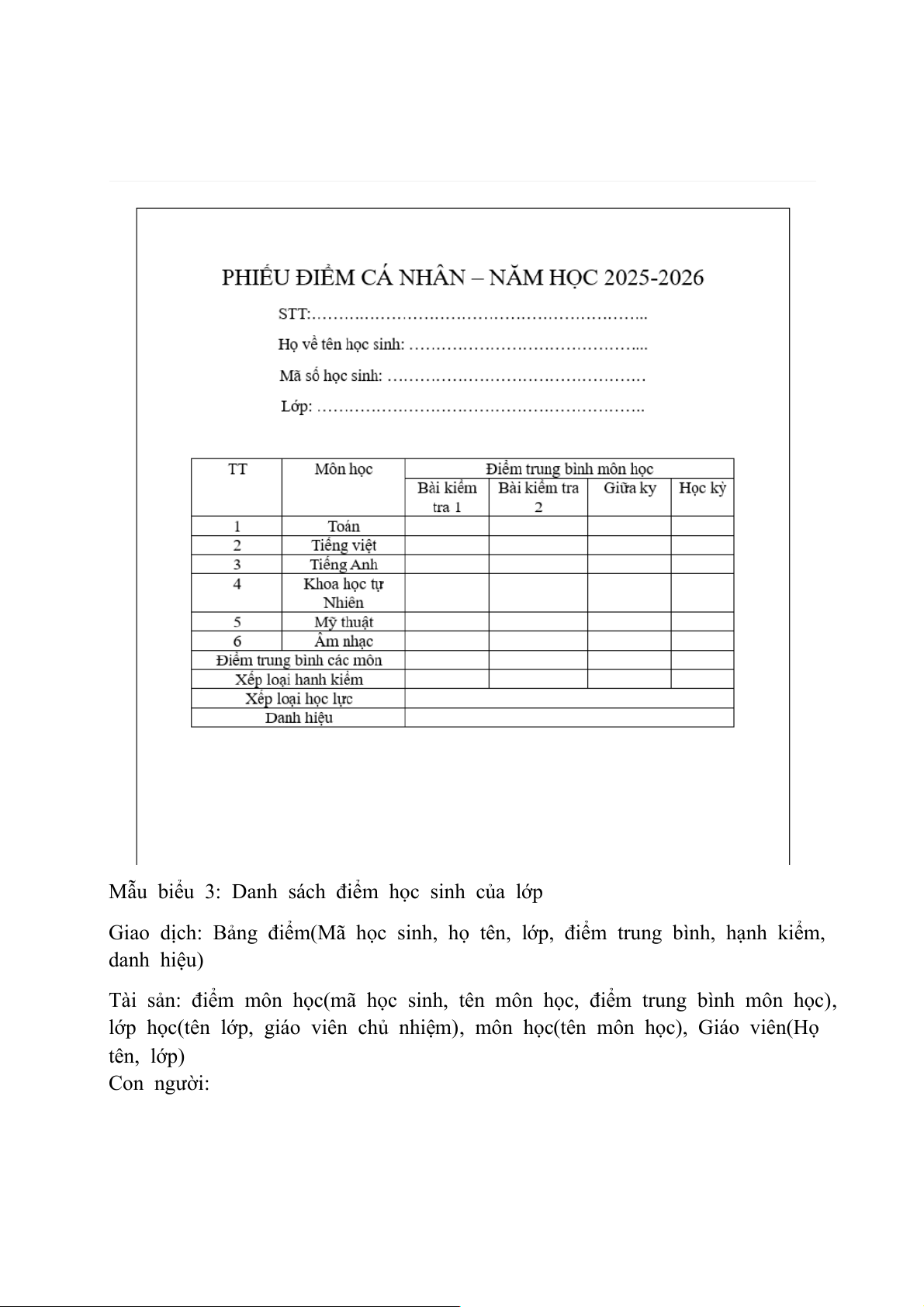 Mẫu biểu 3: Danh sách điểm học sinh của lớp