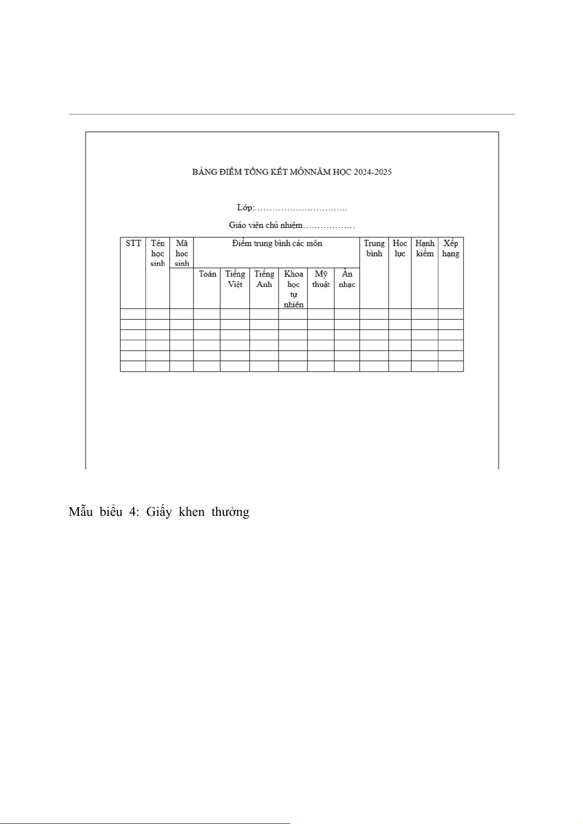 Mẫu biểu 2: Bảng tổng kết điểm học sinh