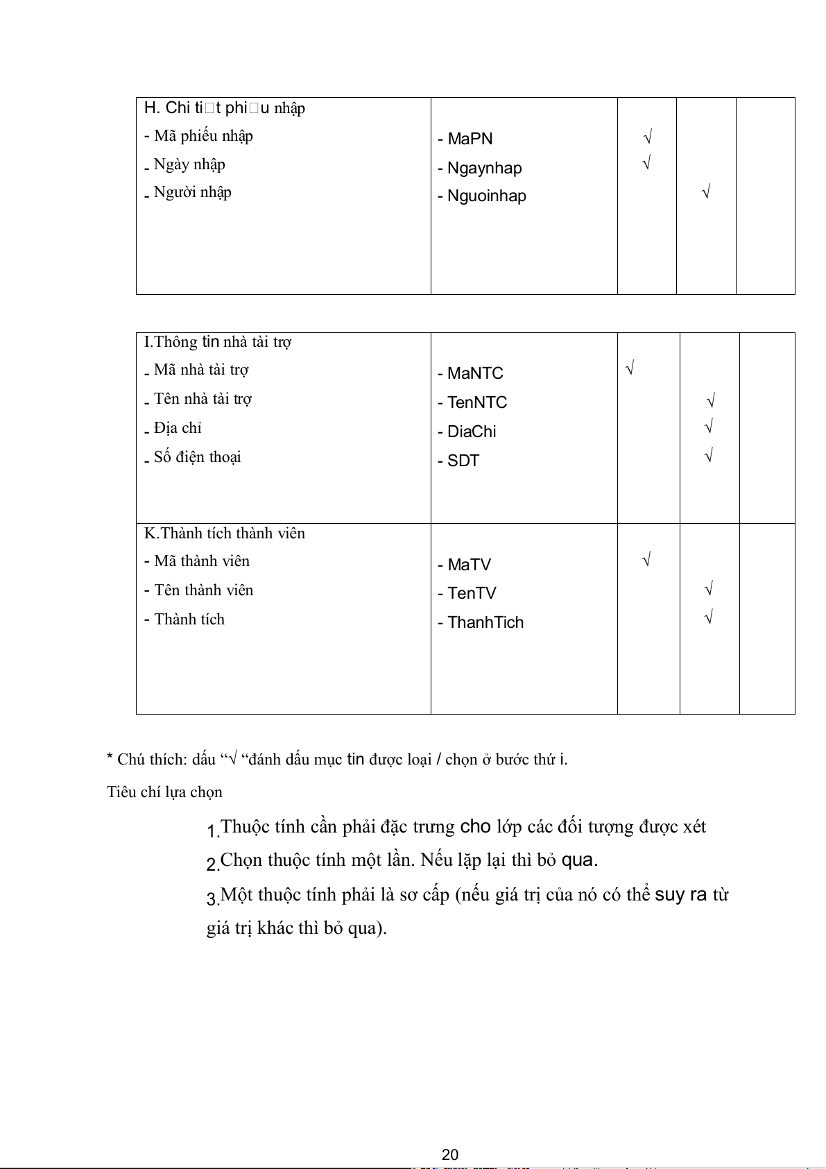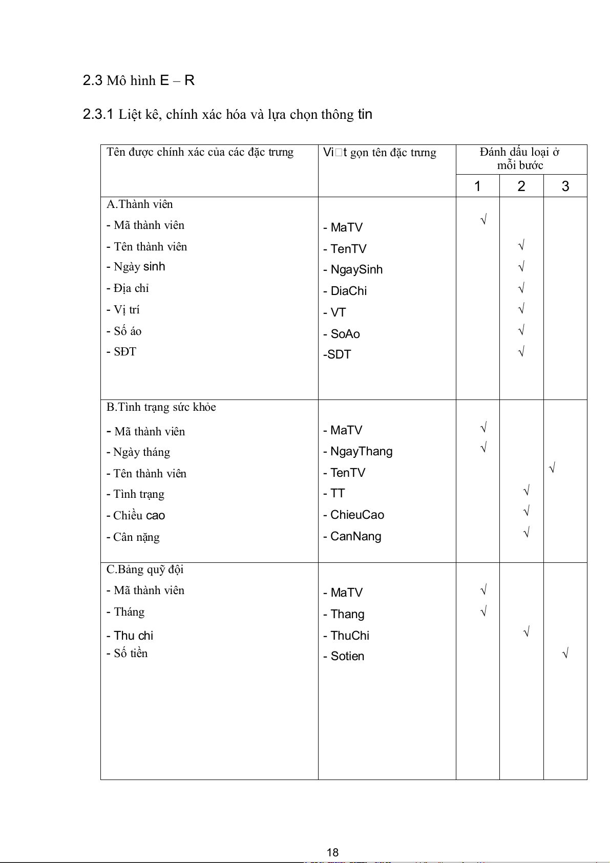 Tên được chính xác của các đặc trưng Vi t gọn tên đặc trưng Đánh dấu loại ở mỗi bước 1 2 3 A.Thành viên - Mã thành viên √ - MaTV - Tên thành viên - TenTV √ - Ngày sinh - NgaySinh √ - Địa chỉ - DiaChi √ - Vị trí - V T √ - Số áo - SoAo √ - SĐT -SDT √ B.Tình trạng sức khỏe - Mã thành viên - MaTV √ - Ngày tháng - NgayThang √ - Tên thành viên - TenTV √ - Tình trạng - TT √ - Chiều ca o - ChieuCao √ - Cân nặng - CanNang √ C.Bảng quỹ đội - Mã thành viên - MaTV √ - Tháng - Thang √ - Thu chi - ThuChi √ - Số tiền - Sotien √ 18 D.Thông tin thi đấu - Mã lịch thi đấu - MaLTD √ - Địa điểm - DiaDiem √ - Số áo - SoAo - Vị trí - ViTri √ - Mã thành viên - MaTV √ - Tên thành viên - TenTV √ - Đội hình -D H √