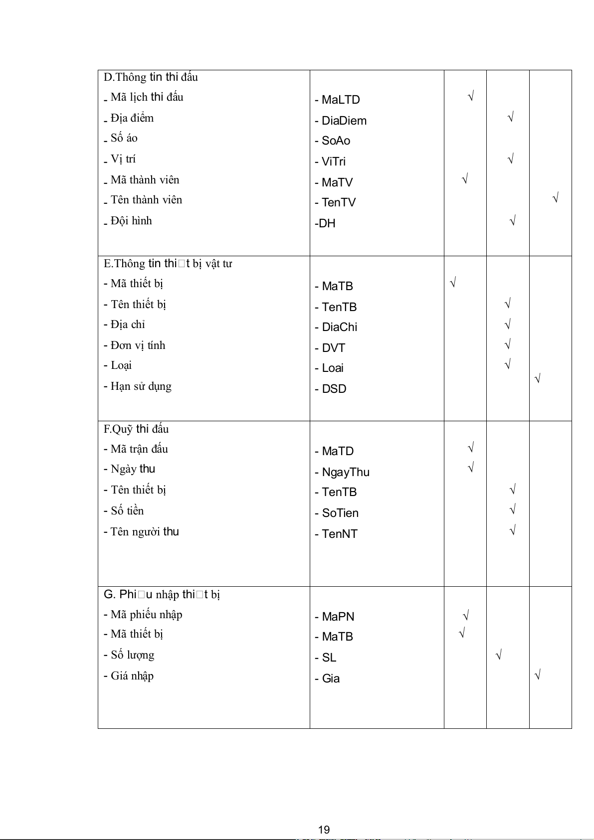 E.Thông tin thi t bị vật tư - Mã thiết bị - MaTB √ - Tên thiết bị - TenTB √ - Địa chỉ - DiaChi √ - Đơn vị tính - DV T √ - Loại - Loai √ - Hạn sử dụng √ - DSD F.Quỹ thi đấu - Mã trận đấu - MaTD √ - Ngày thu - NgayThu √ - Tên thiết bị - TenTB √ - Số tiền - SoTien √ - Tên người thu - TenNT √ G. Phi u nhập thi t bị - Mã phiếu nhập - MaPN √ - Mã thiết bị - MaTB √ - Số lượng - SL √ - Giá nhập - Gia √ 19 H. Chi ti t phi u nhập - Mã phiếu nhập - MaPN √ - Ngày nhập - Ngaynhap √ - Người nhập - Nguoinhap √ I.Thông tin nhà tài trợ - Mã nhà tài trợ - MaNTC √ - Tên nhà tài trợ - TenNTC √ - Địa chỉ - DiaChi √ - Số điện thoại - SDT √ K.Thành tích thành viên - Mã thành viên - MaTV √ - Tên thành viên - TenTV √ - Thành tích - ThanhTich √