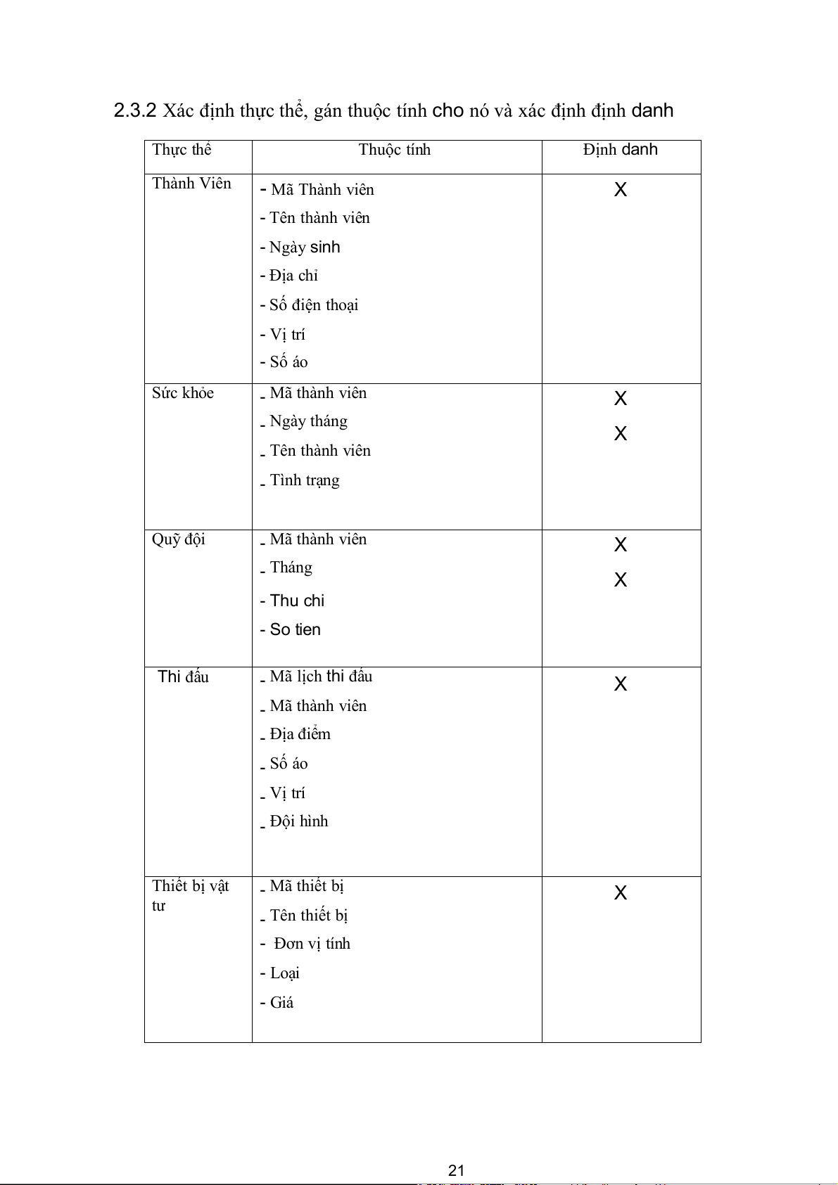 ó và xác định định danh Thực thể Thuộc tính Định danh Thành Viên - Mã Thành viên X - Tên thành viên - Ngày sinh - Địa chỉ - Số điện thoại - Vị trí - Số áo Sức khỏe - Mã thành viên X - Ngày tháng X - Tên thành viên - Tình trạng Quỹ đội - Mã thành viên X - Tháng X - Thu chi - So tien Thi đấu - Mã lịch thi đấu X - Mã thành viên - Địa điểm - Số áo - Vị trí - Đội hình Thiết bị vật - Mã thiết bị X tư - Tên thiết bị - Đơn vị tính - Loại - Giá 21