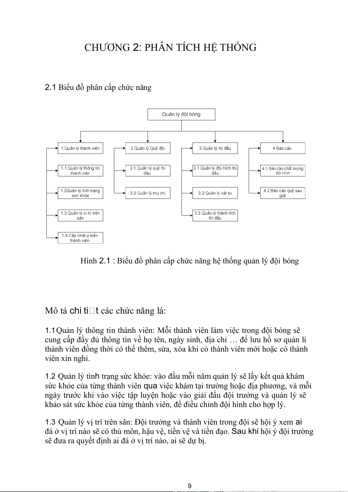 Hình 2.1 : Biểu đồ phân cấp chức năng hệ thống quản lý đội bóng