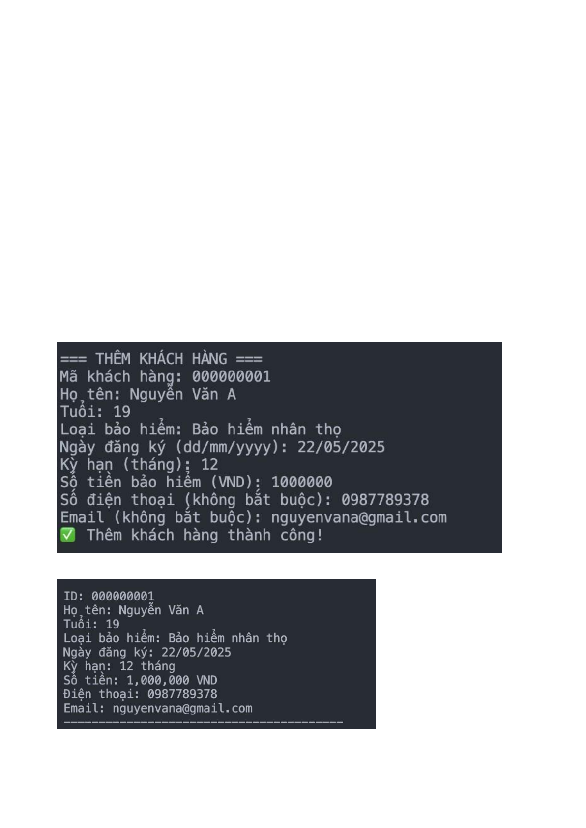 Phần kết quả khi chọn chức năng thêm thông tin khách hàng