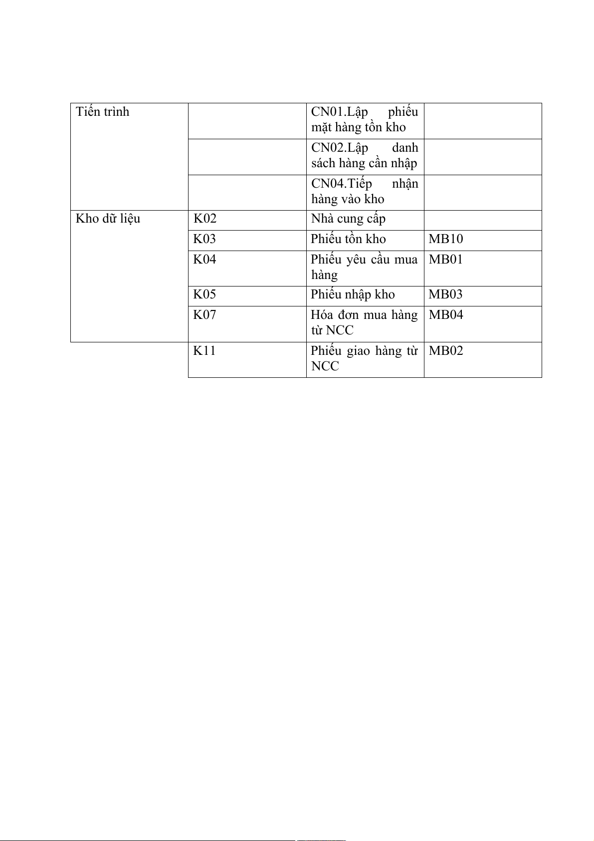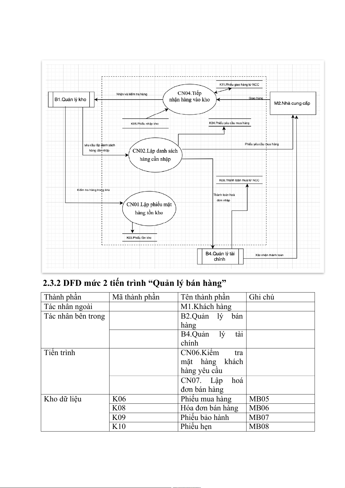 2.3.1 DFD mức 2 tiến trình “ Quản lý kho hàng” Thành phần Mã thành phần Tên thành phần Ghi chú Tác nhân ngoài M2.Nhà cung cấp Tác nhân bên trong B1.Quản lý kho B2.Quản lý tài chính Tiến trình CN01.Lập phiếu mặt hàng tồn kho CN02.Lập danh sách hàng cần nhập CN04.Tiếp nhận hàng vào kho Kho dữ liệu K02 Nhà cung cấp K03 Phiếu tồn kho MB10 K04 Phiếu yêu cầu mua MB01 hàng K05 Phiếu nhập kho MB03 K07 Hóa đơn mua hàng MB04 từ NCC K11 Phiếu giao hàng từ MB02 NCC