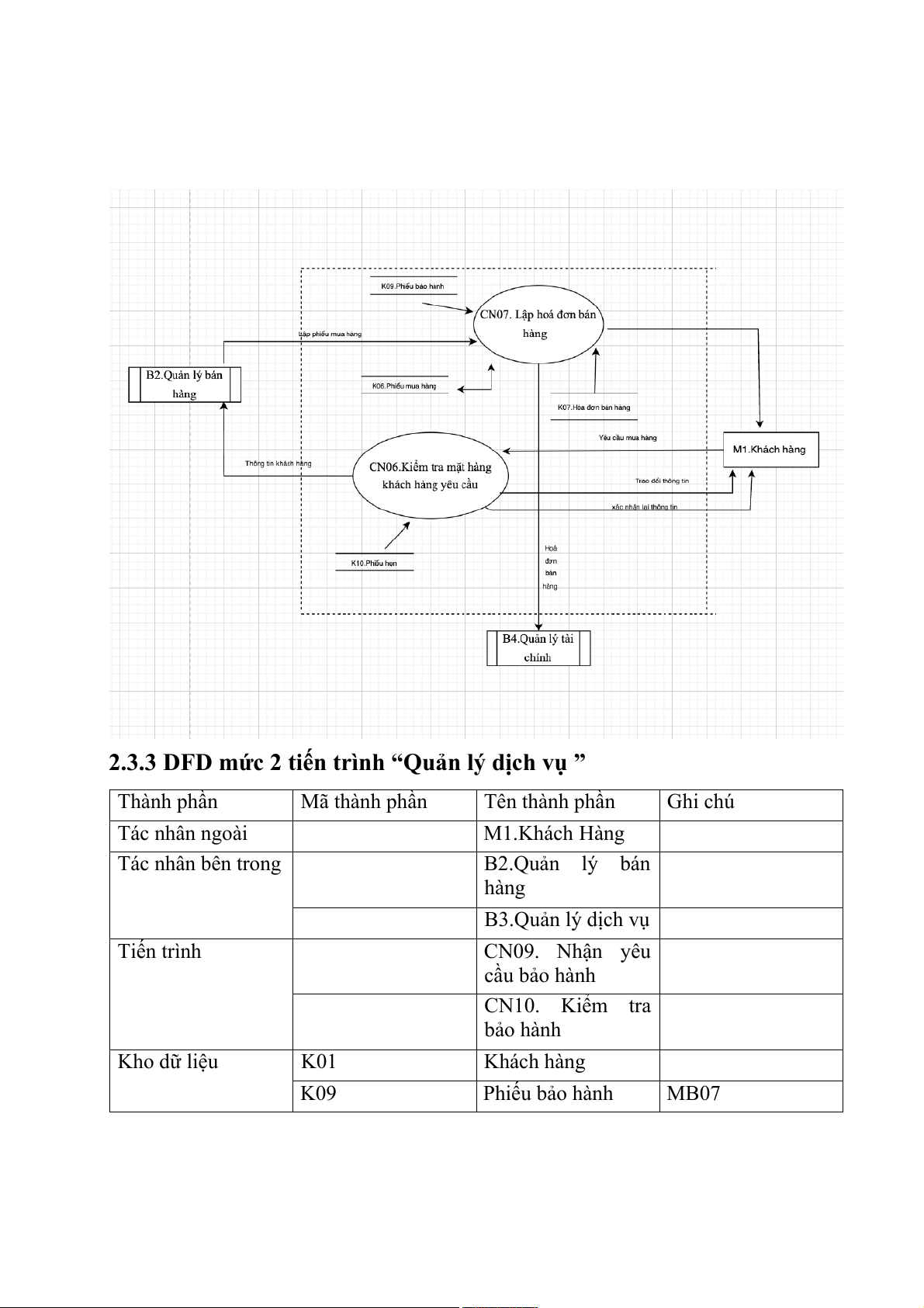2.3.3 DFD mức 2 tiến trình “Quản lý dịch vụ ” Thành phần Mã thành phần Tên thành phần Ghi chú Tác nhân ngoài M1.Khách Hàng Tác nhân bên trong B2.Quản lý bán hàng B3.Quản lý dịch vụ Tiến trình CN09. Nhận yêu cầu bảo hành CN10. Kiểm tra bảo hành Kho dữ liệu K01 Khách hàng K09 Phiếu bảo hành MB07