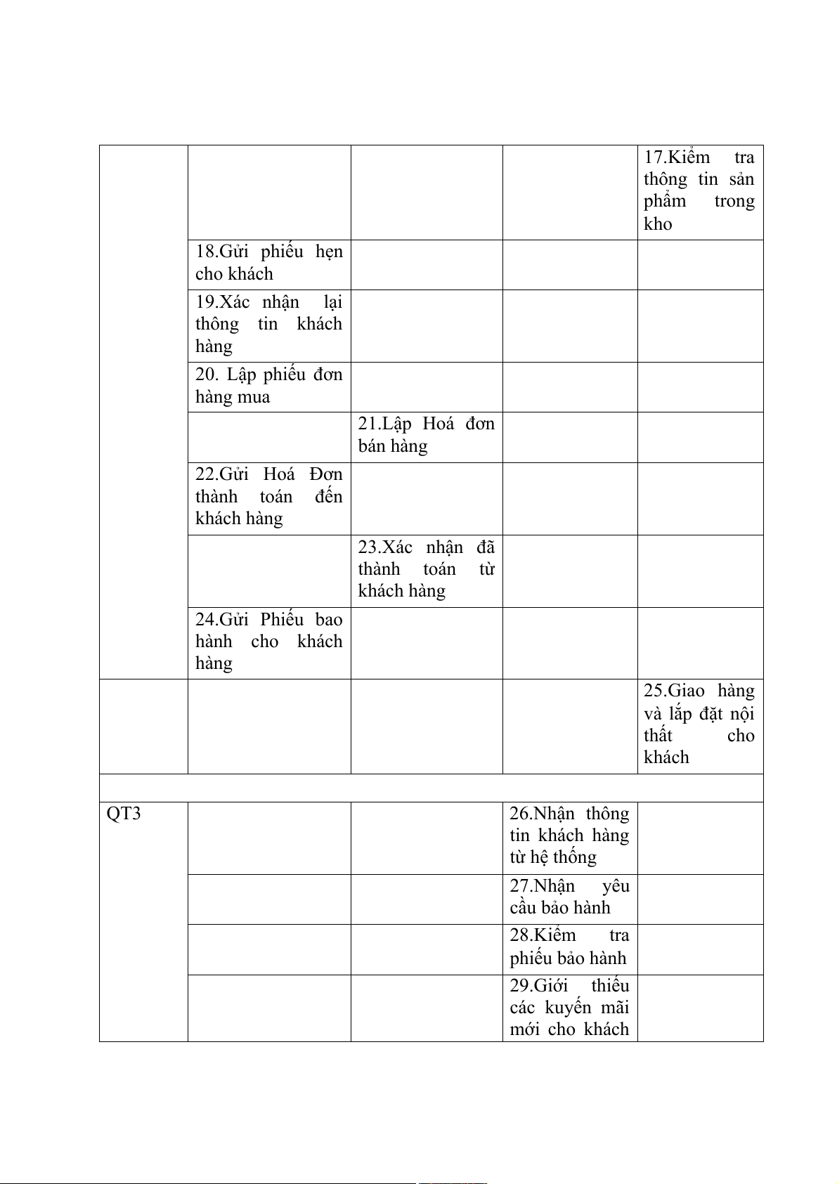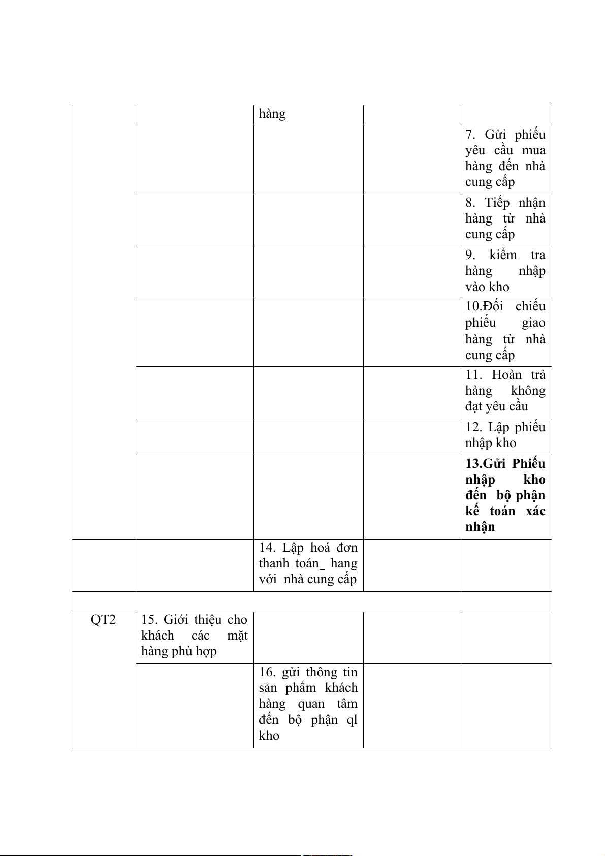 ra danh sách chức năng có thể có của hệ thống. (BT1 phần 1.3 Quy trình xử lý) BP03.BP BP04.QL kho BP BP01.BP Bán BP02.BP Kế toán Chăm sóc Hàng QT khách hàng QT1 1.Kiểm tra lương hàng tồn trong kho 2.Lập Phiếu tồn kho 3.Gửi Phiếu hàng tồn đến bộ phận kế toán 4. Lập phiếu yêu cầu mua hàng 5. Gửi phiếu yêu cầu mua hàng đến bộ phận kế toán 6.Phê duyệt và xác nhận phiếu yêu cầu mua hàng 7. Gửi phiếu yêu cầu mua hàng đến nhà cung cấp 8. Tiếp nhận hàng từ nhà cung cấp 9. kiểm tra hàng nhập vào kho 10.Đối chiếu phiếu giao hàng từ nhà cung cấp 11. Hoàn trả hàng không đạt yêu cầu 12. Lập phiếu nhập kho 13.Gửi Phiếu nhập kho đến bộ phận kế toán xác nhận 14. Lập hoá đơn thanh toán hang với nhà cung cấp QT2 15. Giới thiệu cho khách các mặt hàng phù hợp 16. gửi thông tin sản phẩm khách hàng quan tâm đến bộ phận ql kho 17.Kiểm tra thông tin sản phẩm trong kho 18.Gửi phiếu hẹn cho khách 19.Xác nhận lại thông tin khách hàng 20. Lập phiếu đơn hàng mua 21.Lập Hoá đơn bán hàng 22.Gửi Hoá Đơn thành toán đến khách hàng 23.Xác nhận đã thành toán từ khách hàng 24.Gửi Phiếu bao hành cho khách hàng 25.Giao hàng và lắp đặt nội thất cho khách QT3 26.Nhận thông tin khách hàng từ hệ thống 27.Nhận yêu cầu bảo hành 28.Kiểm tra phiếu bảo hành 29.Giới thiếu các kuyến mãi mới cho khách hàng 30.Gửi thông tin đến bộ phận quản lý kho 31.Đổi trả bảo hành nội thất cho khách QT 4 32.Yêu cầu lập báo cáo thu chi 33.Gửi phiếu hàng tồn kho đến bộ phận kế toán 34.Gửi phiếu yếu cầu mua hàng đến bộ phận kế toán 35.Gửi Phiếu nhập kho đến bộ phận kế toán xác nhận 36.gửi phiếu mua đến bộ phận kế toán 37.Kiểm tra thống kế các số liệu 38.Lập báo cáo Thu chi