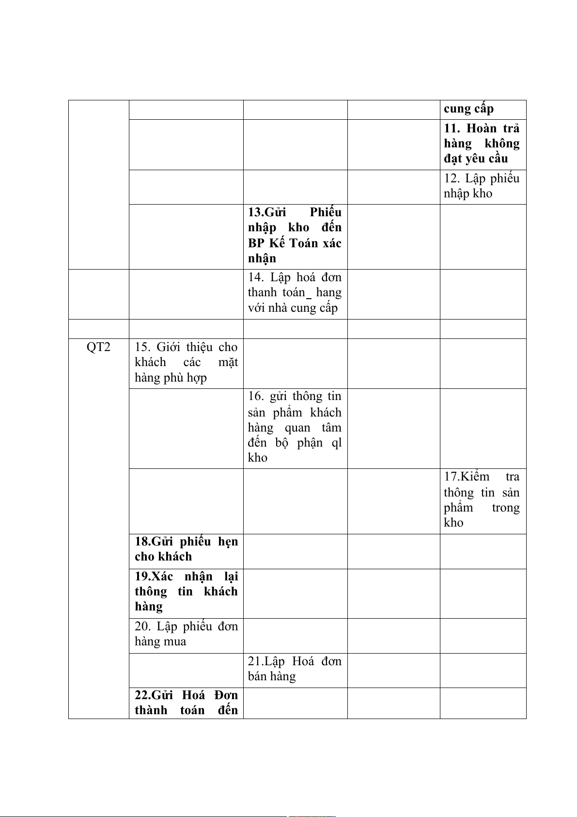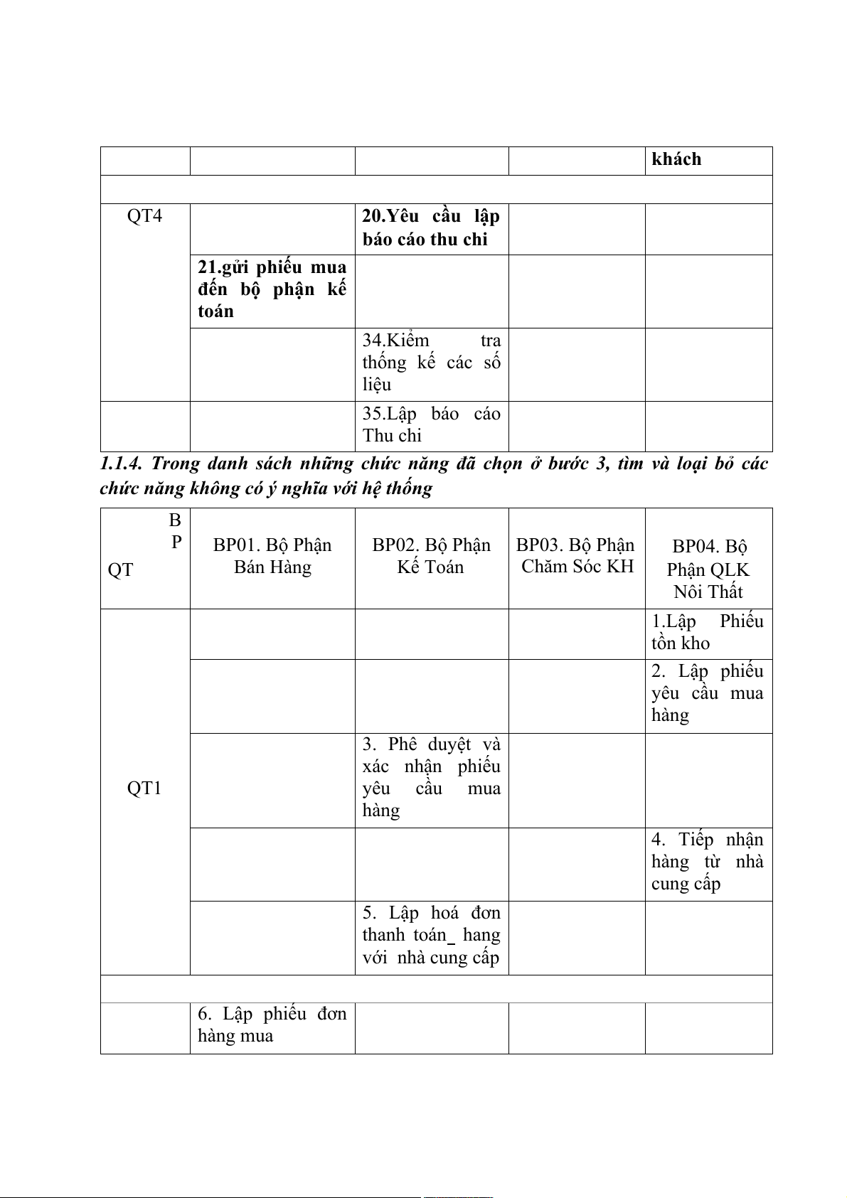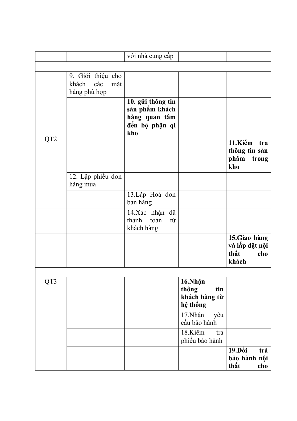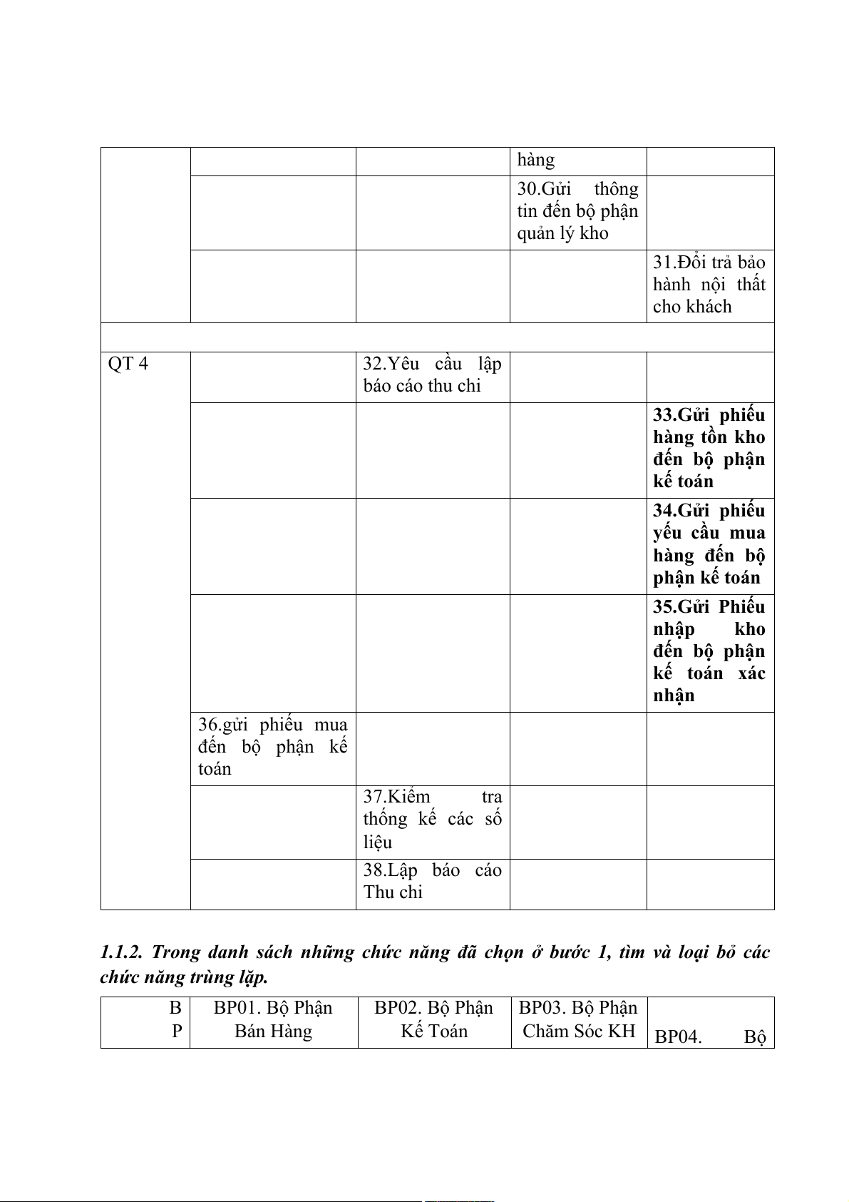 chức năng không có ý nghĩa với hệ thống B P BP01. Bộ Phận BP02. Bộ Phận BP03. Bộ Phận BP04. Bộ QT Bán Hàng Kế Toán Chăm Sóc KH Phận QLK Nôi Thất 1.Lập Phiếu tồn kho 2. Lập phiếu yêu cầu mua hàng 3. Phê duyệt và xác nhận phiếu QT1 yêu cầu mua hàng 4. Tiếp nhận hàng từ nhà cung cấp 5. Lập hoá đơn thanh toán hang với nhà cung cấp 6. Lập phiếu đơn hàng mua QT2 7.Lập Hoá đơn bán hàng 8.Xác nhận đã thành toán từ khách hàng QT3 9.Nhận yêu cầu bảo hành 10.Kiểm tra phiếu bảo hành QT4 11.Kiểm tra thống kế các số liệu 12.Lập báo cáo Thu chi