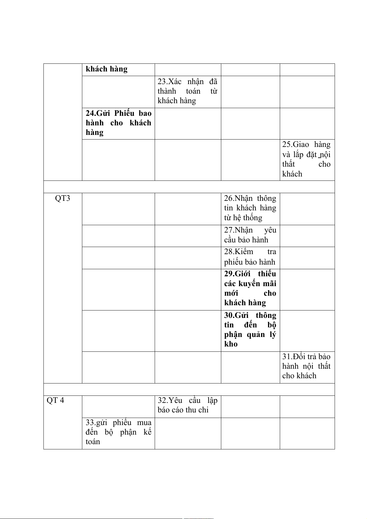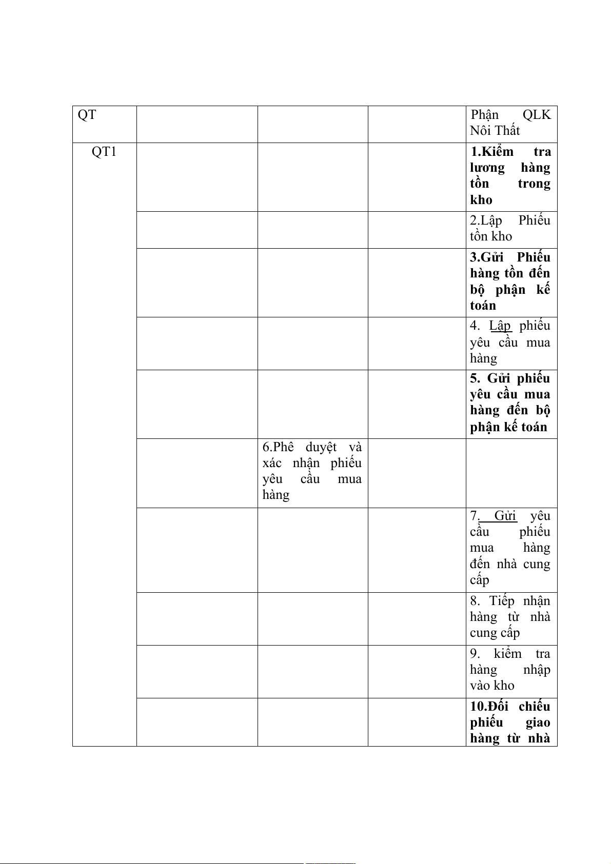 năng đơn giản lại. B P BP01. Bộ Phận BP02. Bộ Phận BP03. Bộ Phận BP04. Bộ QT Bán Hàng Kế Toán Chăm Sóc KH Phận QLK Nôi Thất QT1 1.Lập Phiếu tồn kho 2. Lập phiếu yêu cầu mua hàng 3.Phê duyệt và xác nhận phiếu yêu cầu mua hàng 4. Gửi yêu cầu phiếu mua hàng đến nhà cung cấp 5. Tiếp nhận hàng từ nhà cung cấp 6. kiểm tra hàng nhập vào kho 7. Lập phiếu nhập kho 8. Lập hoá đơn thanh toán hang với nhà cung cấp 9. Giới thiệu cho khách các mặt hàng phù hợp 10. gửi thông tin sản phẩm khách hàng quan tâm đến bộ phận ql kho QT2 11.Kiểm tra thông tin sản phẩm trong kho 12. Lập phiếu đơn hàng mua 13.Lập Hoá đơn bán hàng 14.Xác nhận đã thành toán từ khách hàng 15.Giao hàng và lắp đặt nội thất cho khách QT3 16.Nhận thông tin khách hàng từ hệ thống 17.Nhận yêu cầu bảo hành 18.Kiểm tra phiếu bảo hành 19.Đổi trả bảo hành nội thất cho khách QT4 20.Yêu cầu lập báo cáo thu chi 21.gửi phiếu mua đến bộ phận kế toán 34.Kiểm tra thống kế các số liệu 35.Lập báo cáo Thu chi