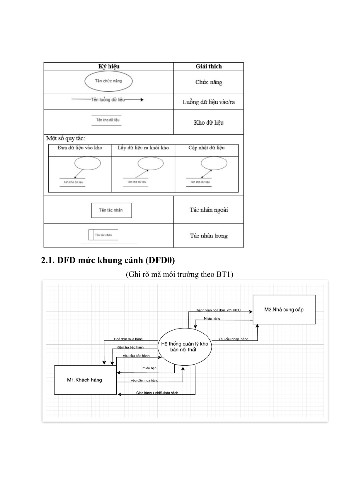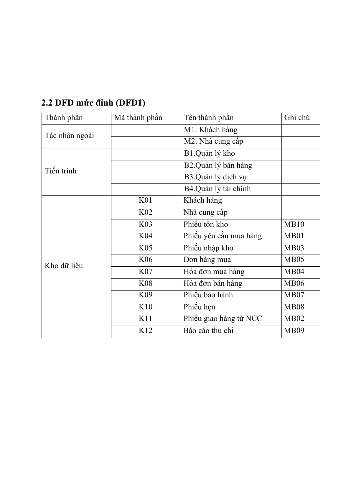2.2 DFD mức đỉnh (DFD1) Thành phần Mã thành phần Tên thành phần Ghi chú M1. Khách hàng Tác nhân ngoài M2. Nhà cung cấp B1.Quản lý kho B2.Quản lý bán hàng Tiến trình B3.Quản lý dịch vụ B4.Quản lý tài chính K01 Khách hàng K02 Nhà cung cấp K03 Phiếu tồn kho MB10 K04 Phiếu yêu cầu mua hàng MB01 K05 Phiếu nhập kho MB03 K06 Đơn hàng mua MB05 Kho dữ liệu K07 Hóa đơn mua hàng MB04 K08 Hóa đơn bán hàng MB06 K09 Phiếu bảo hành MB07 K10 Phiếu hẹn MB08 K11 Phiếu giao hàng từ NCC MB02 K12 Báo cáo thu chi MB09