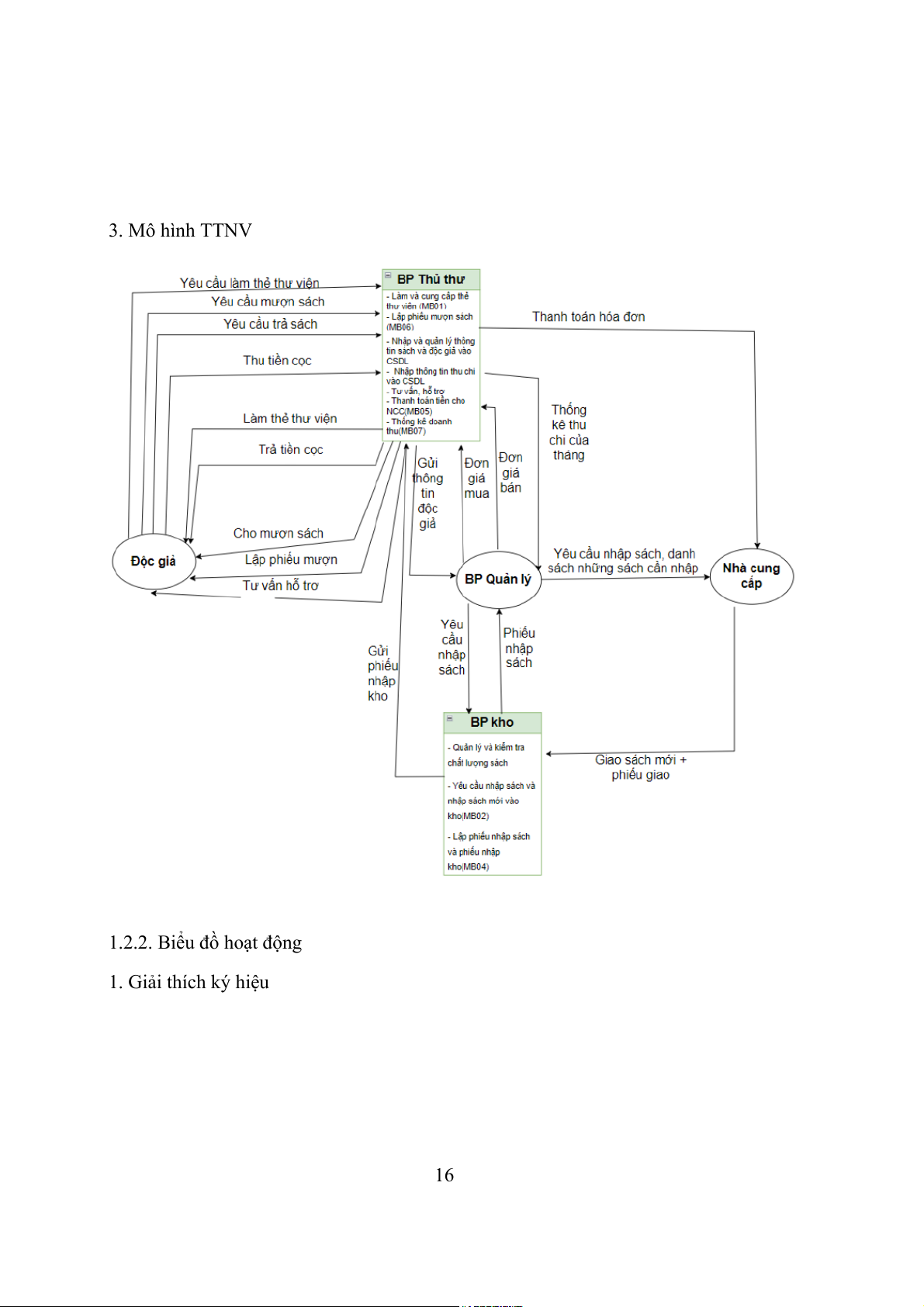 Mẫu biểu tạo ra STT Mã MB Tên mẫu biểu BP tạo ra Nơi sử dụng 1 MB01 Thẻ thư viện BP01 BP01, M1.01 2 MB02 Phiếu nhập sách BP02 M1.02 4 MB04 Phiếu nhập kho BP02 BP01 5 MB05 Hóa đơn thanh toán BP01 M2.01 6 MB06 Phiếu mượn sách BP01 M1.01 7 MB07 Báo cáo thu chi BP01 M2.01 15 3. Mô hình TTNV