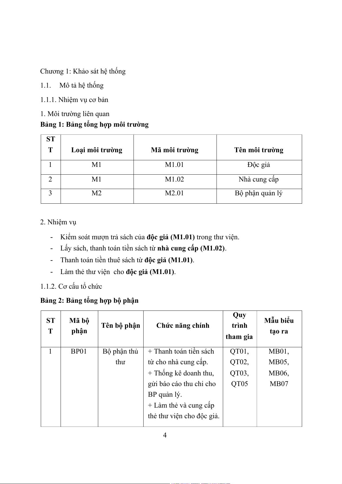 Bảng 1: Bảng tổng hợp môi trường ST T Loại môi trường Mã môi trường Tên môi trường 1 M1 M1.01 Độc giả 2 M1 M1.02 Nhà cung cấp 3 M2 M2.01 Bộ phận quản lý 2. Nhiệm vụ