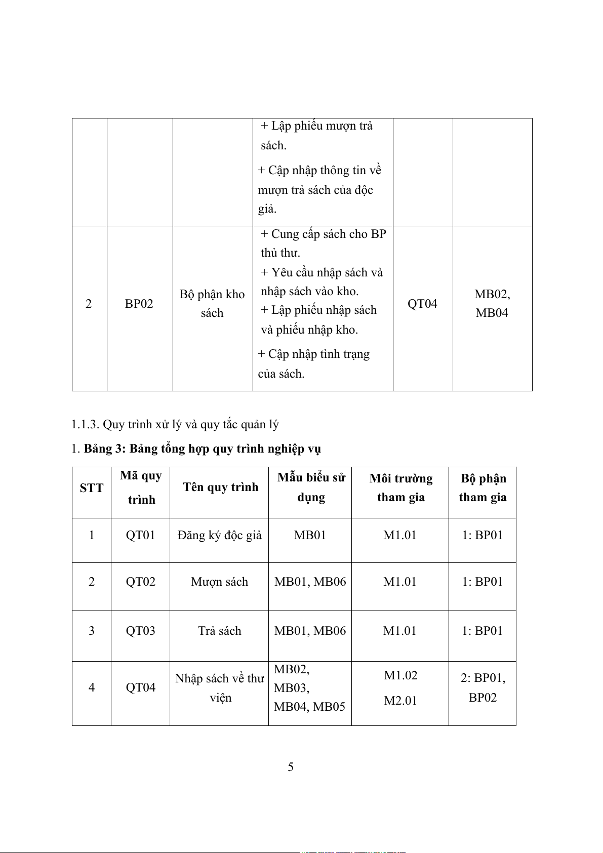 1. Bảng 3: Bảng tổng hợp quy trình nghiệp vụ Mã quy Mẫu biểu sử Môi trường Bộ phận STT Tên quy trình trình dụng tham gia tham gia 1 QT01 Đăng ký độc giả MB01 M1.01 1: BP01 2 QT02 Mượn sách MB01, MB06 M1.01 1: BP01 3 QT03 Trả sách MB01, MB06 M1.01 1: BP01 MB02, Nhập sách về thư M1.02 2: BP01, 4 QT04 MB03, viện BP02 MB04, MB05 M2.01 5 Báo cáo tình hình MB07 5 QT05 thu chi theo từng M2.01 1: BP01 tháng