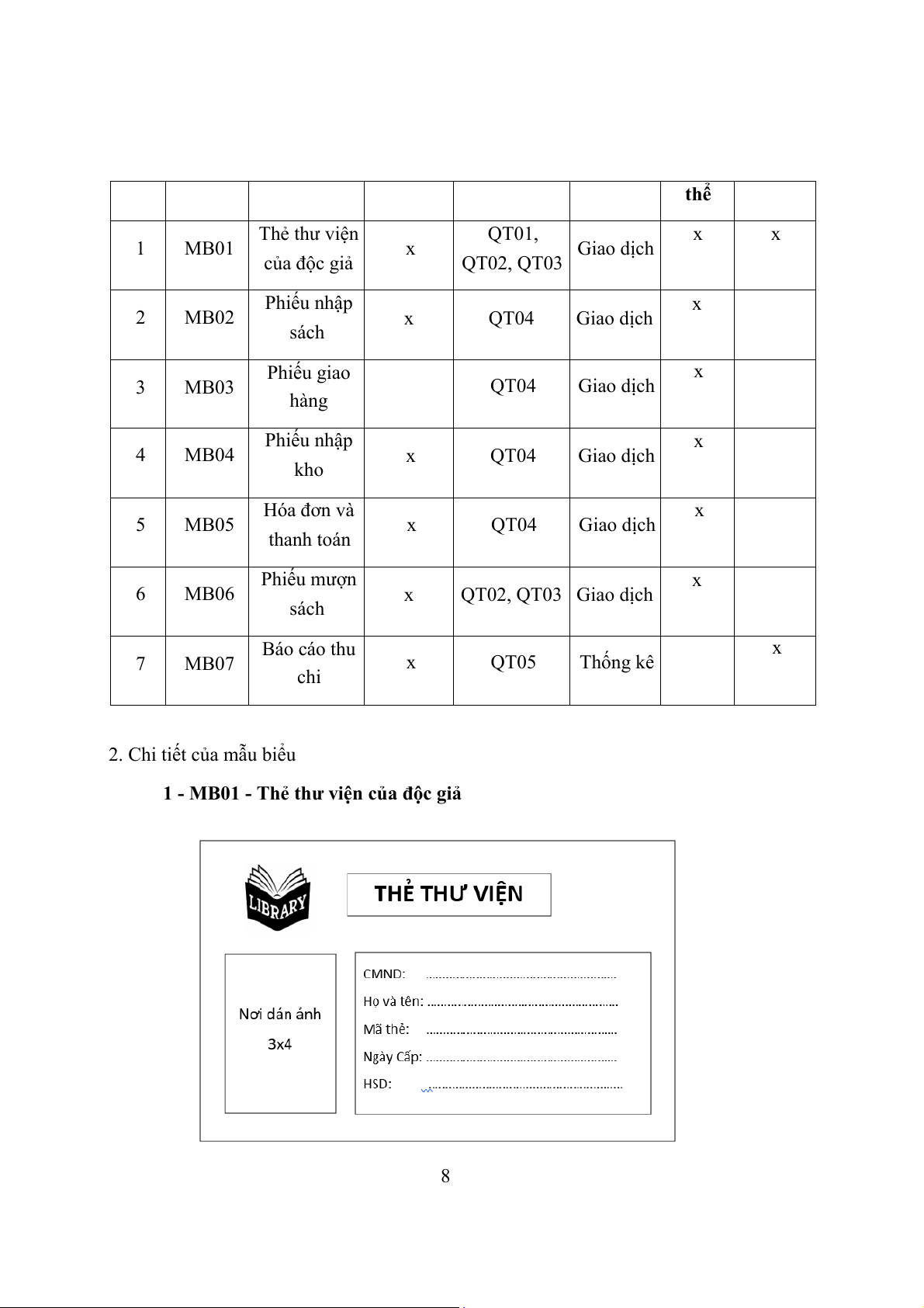 1. Bảng 4: Bảng tổng hợp mẫu biểu STT Mã mẫu Tên mẫu Hệ thống Quy trình Loại dữ Là Sử dụng biểu biểu tạo ra sử dụng liệu kiểu thiết kế thực 7 thể Thẻ thư viện QT01, x x 1 MB01 x Giao dịch của độc giả QT02, QT03 Phiếu nhập x 2 MB02 x QT04 Giao dịch sách Phiếu giao x 3 MB03 QT04 Giao dịch hàng Phiếu nhập x 4 MB04 x QT04 Giao dịch kho Hóa đơn và x 5 MB05 x QT04 Giao dịch thanh toán Phiếu mượn x 6 MB06 x QT02, QT03 Giao dịch sách Báo cáo thu x 7 MB07 x QT05 Thống kê chi