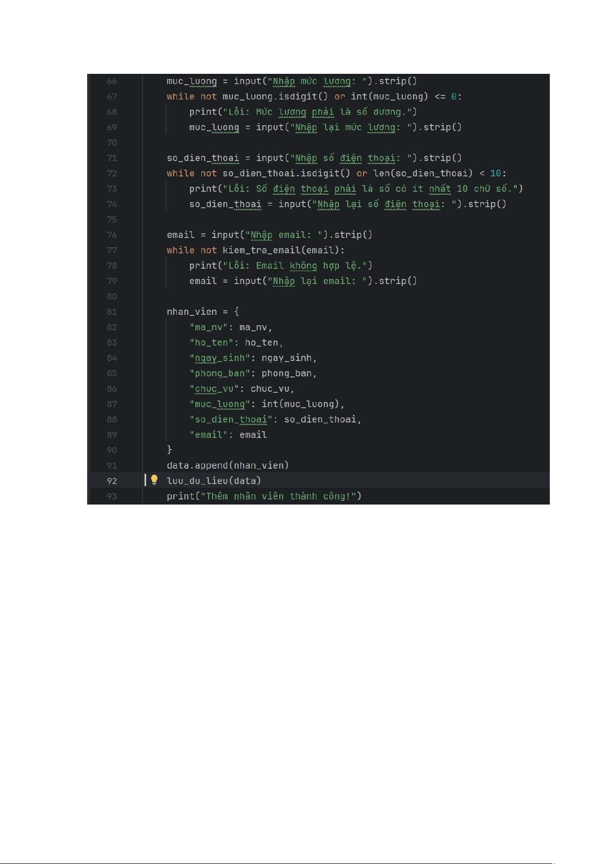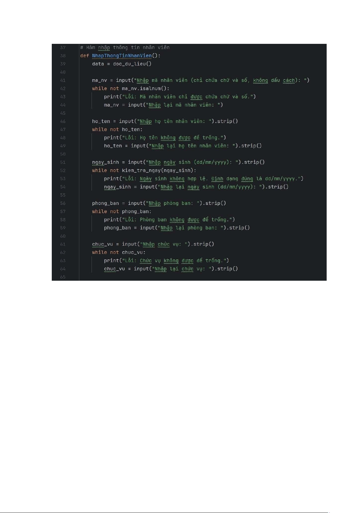- Sau khi nhận đủ thông tin hợp lệ, hàm tạo một từ điển nhan_vien chứa thông tin nhân viên.