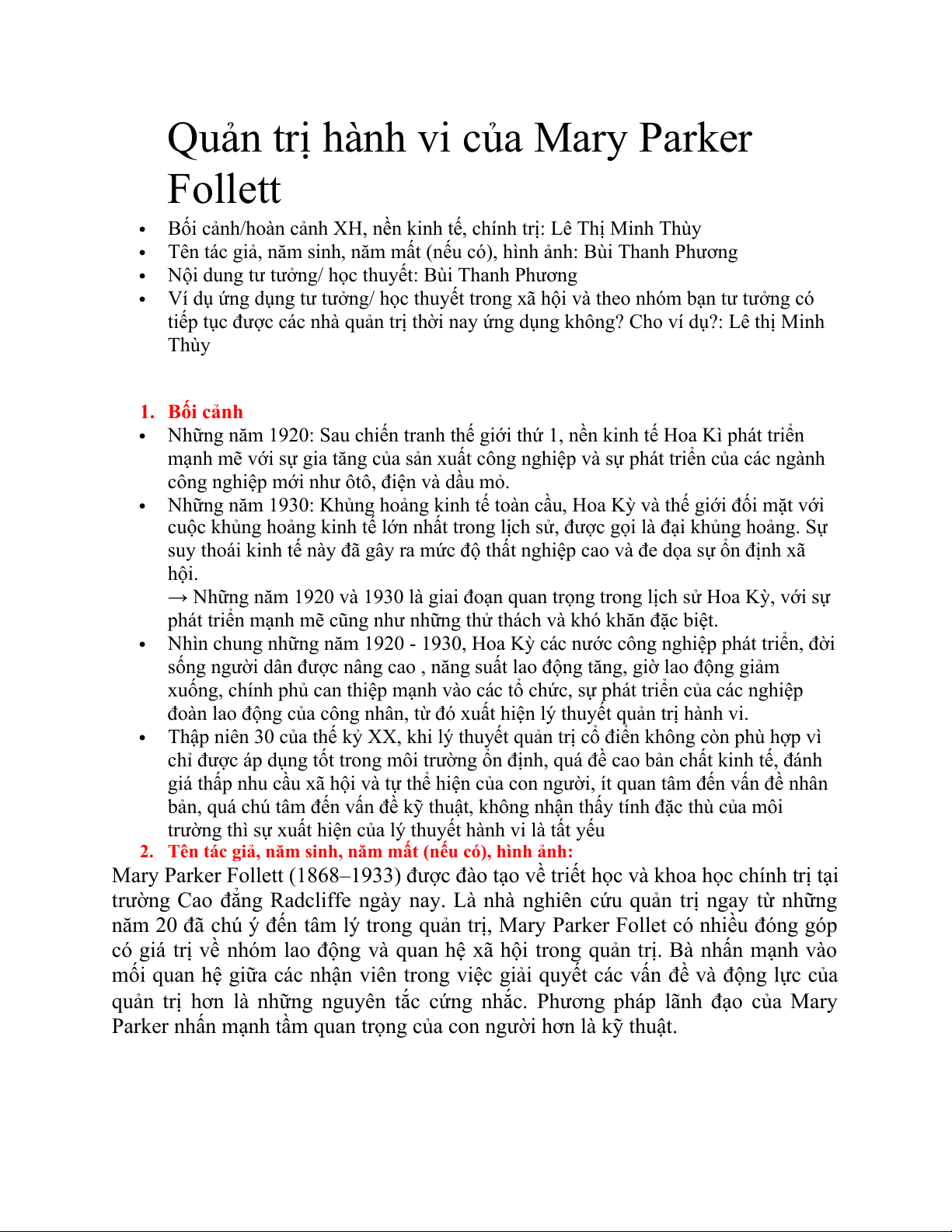 năm 20 đã chú ý đến tâm lý trong quản trị, Mary Parker Follet có nhiều đóng góp