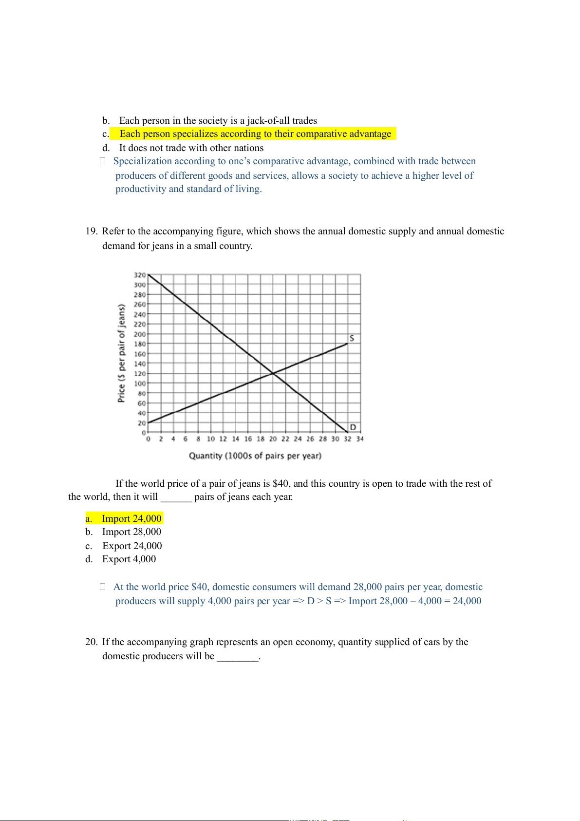 the world, then it will ______ pairs of jeans each year. a. Import 24,000 b. Import 28,000 c. Export 24,000 d. Export 4,000