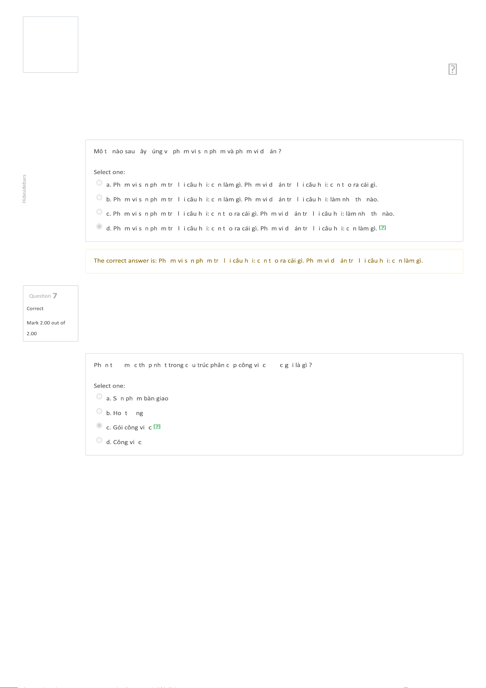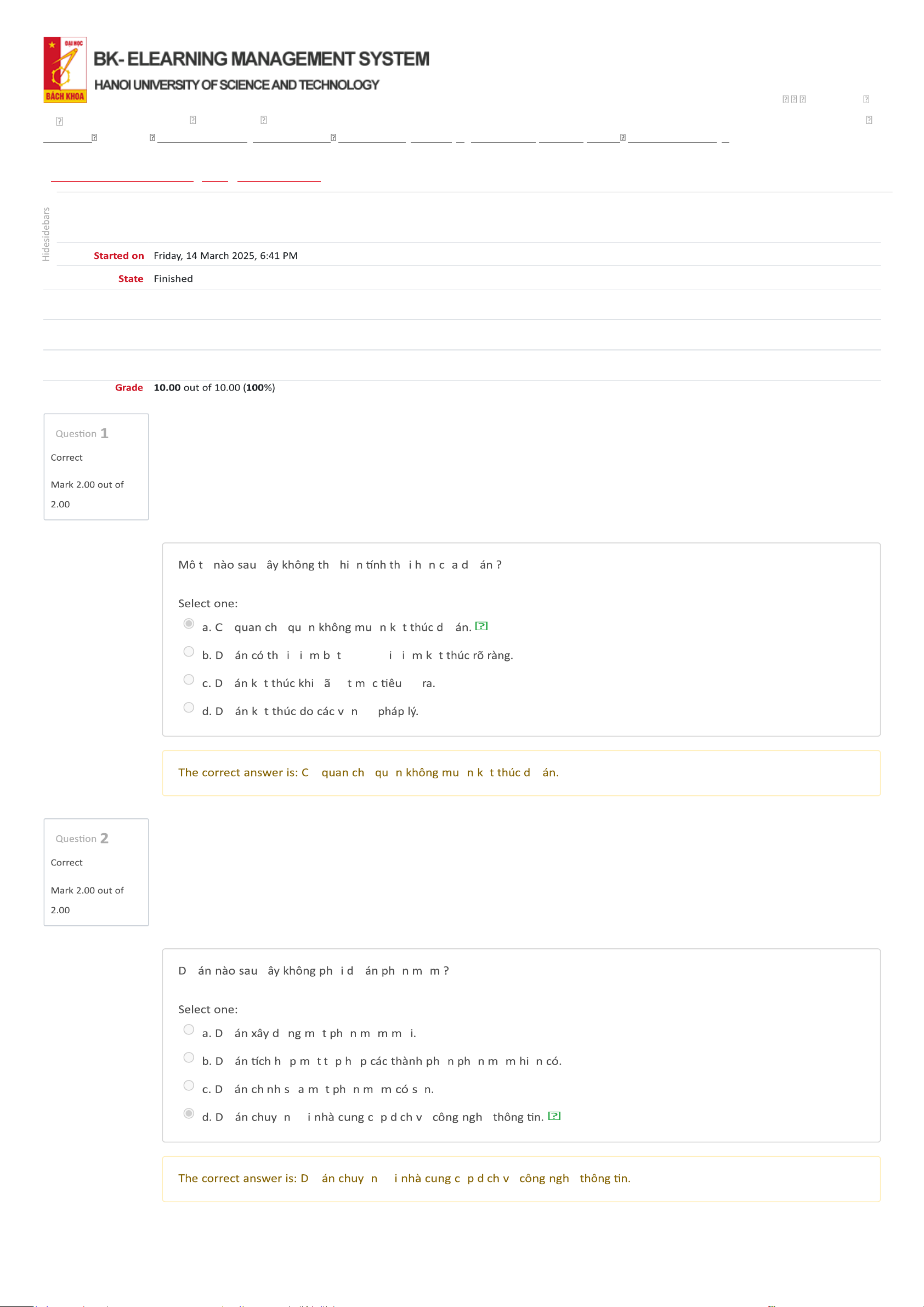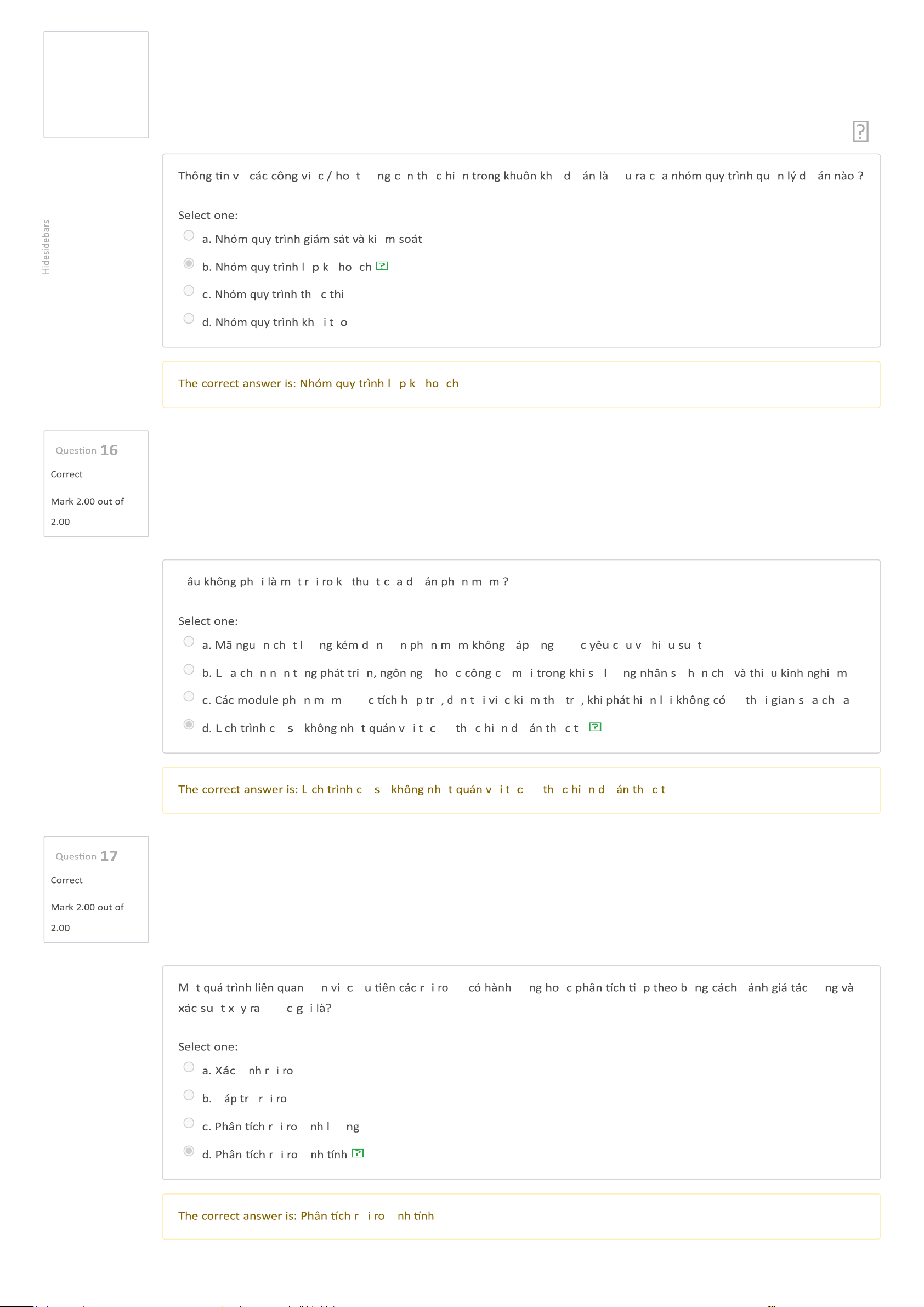 Dashboard My courses BL-IT4082-156723 - Kỹ thuật phần mềm Tuần 5 - Chương 4. Quản lý dự án phần mềm (tiếp theo) (Offline) Quiz Kết thúc chương 4