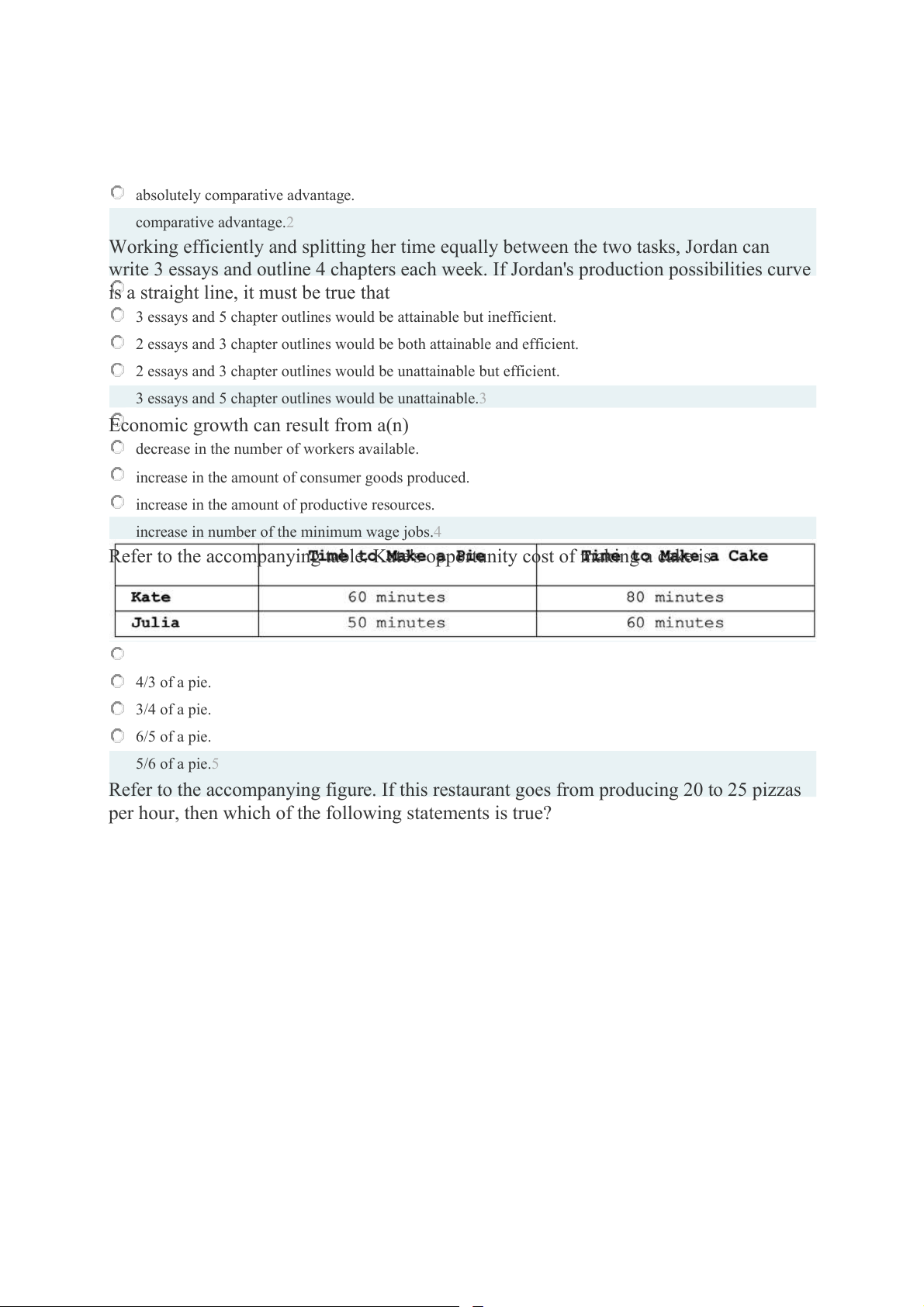 Refer to the accompanying table. Kate's opportunity cost of making a cake is 4/3 of a pie. 3/4 of a pie. 6/5 of a pie. 5/6 of a pie.5