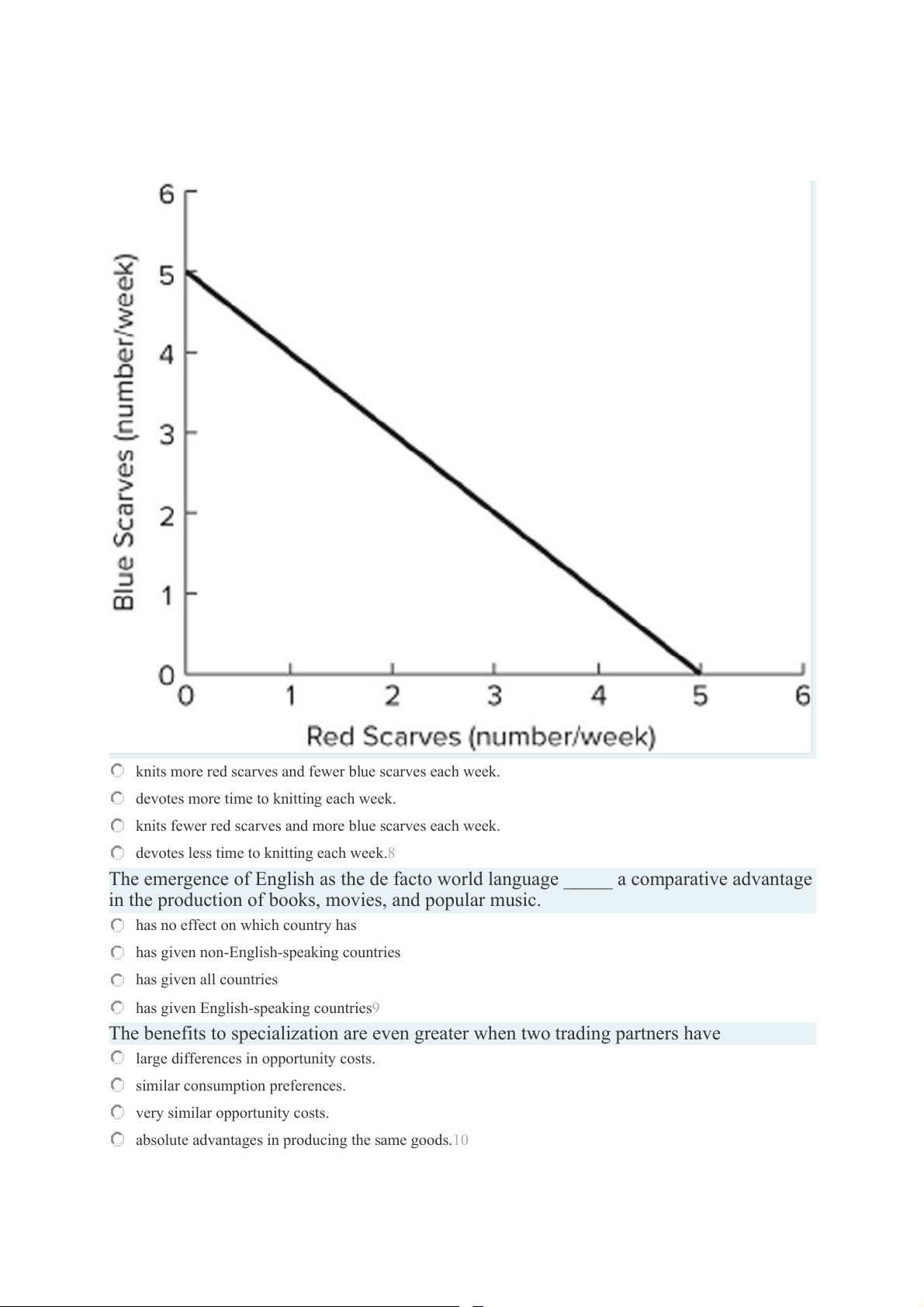 knits fewer red scarves and more blue scarves each week.