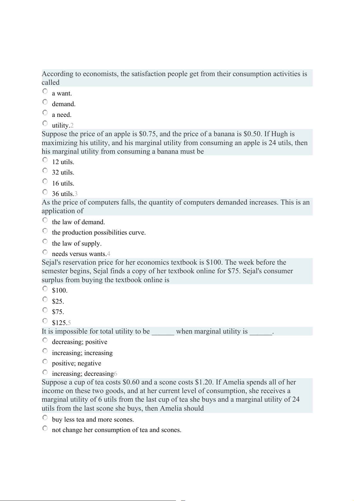 marginal utility of 6 utils from the last cup of tea she buys and a marginal utility of 24