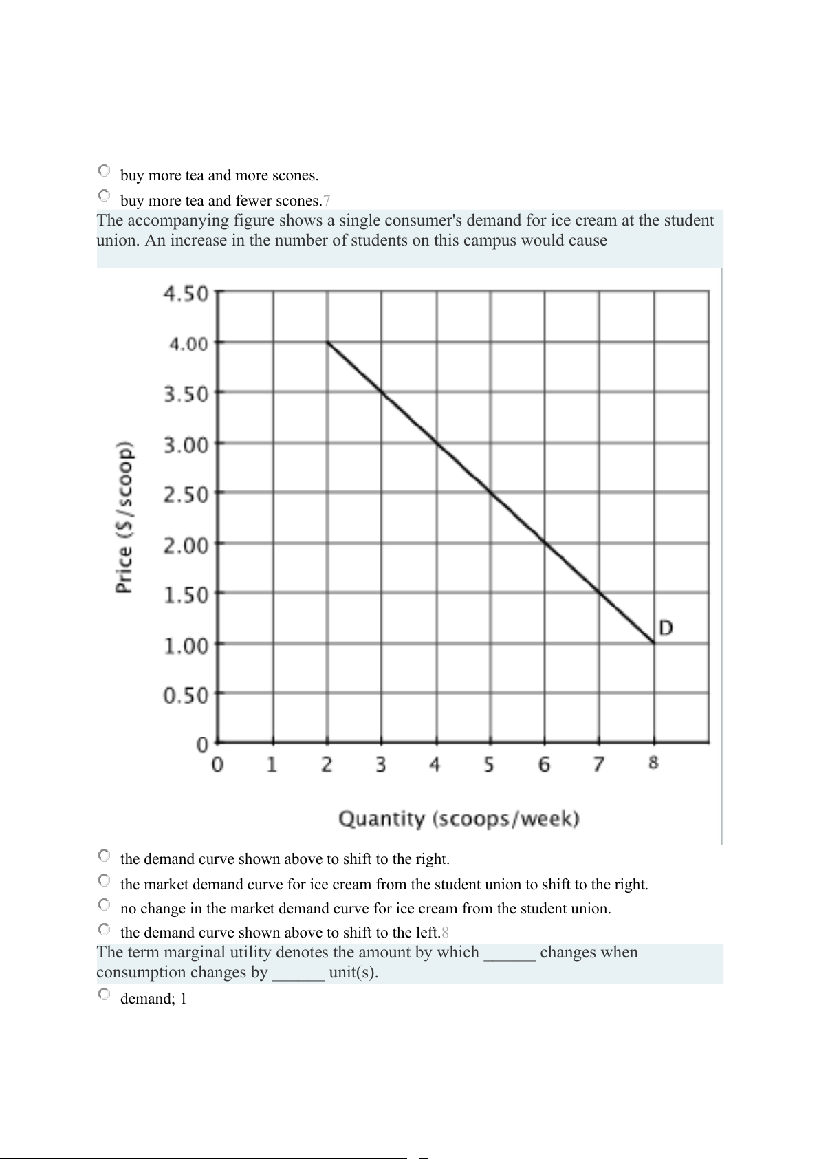 consumption changes by ______ unit(s). demand; 1 total utility; 1 demand; 10 total utility; 109