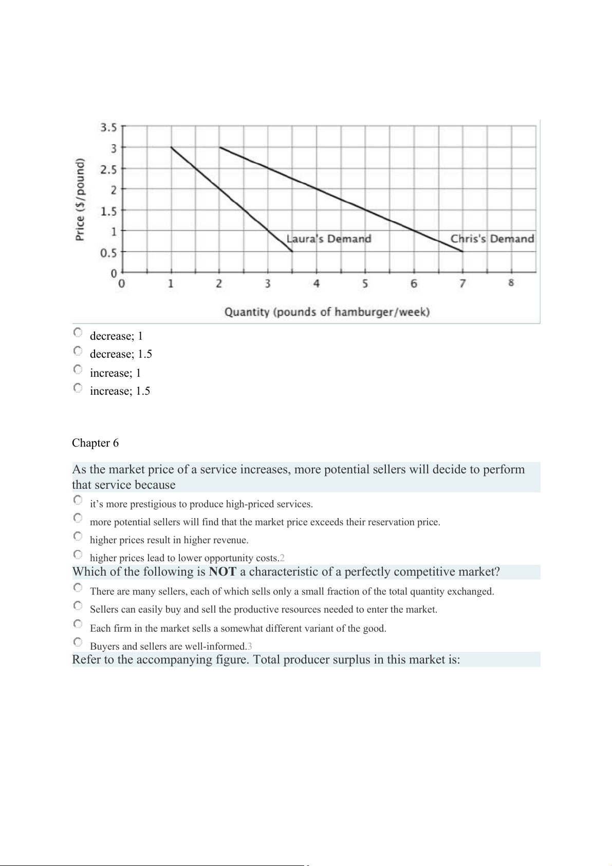 quantity demanded in the market will ______ by ______ pound(s) per week. decrease; 1 decrease; 1.5 increase; 1 increase; 1.5 Chapter 6
