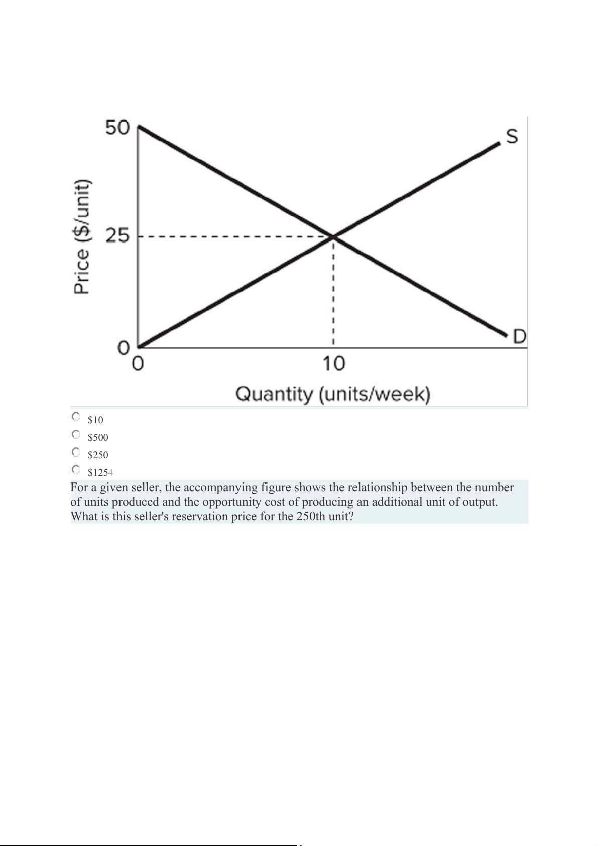 Refer to the accompanying figure. Total producer surplus in this market is: $10 $500 $250 $1254