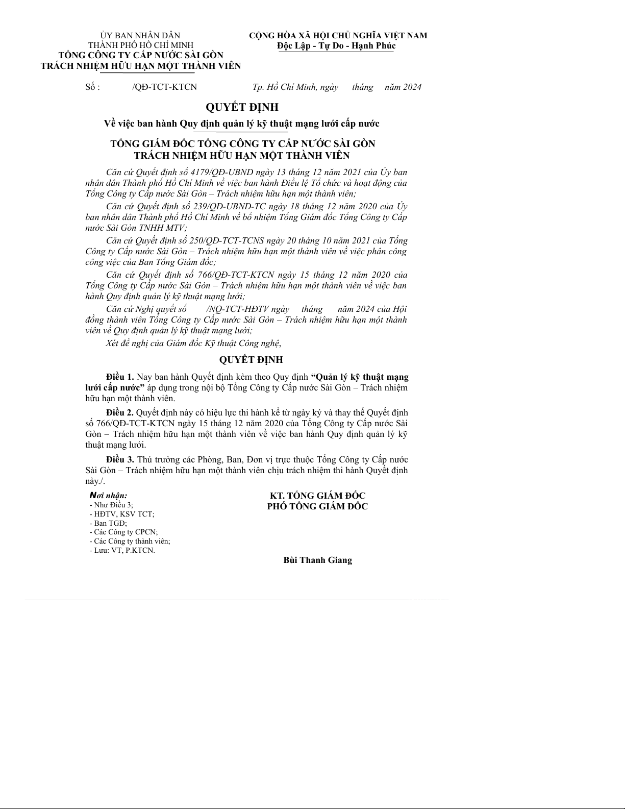 số 766/QĐ-TCT-KTCN ngày 15 tháng 12 năm 2020 của Tổng Công ty Cấp nước Sài
