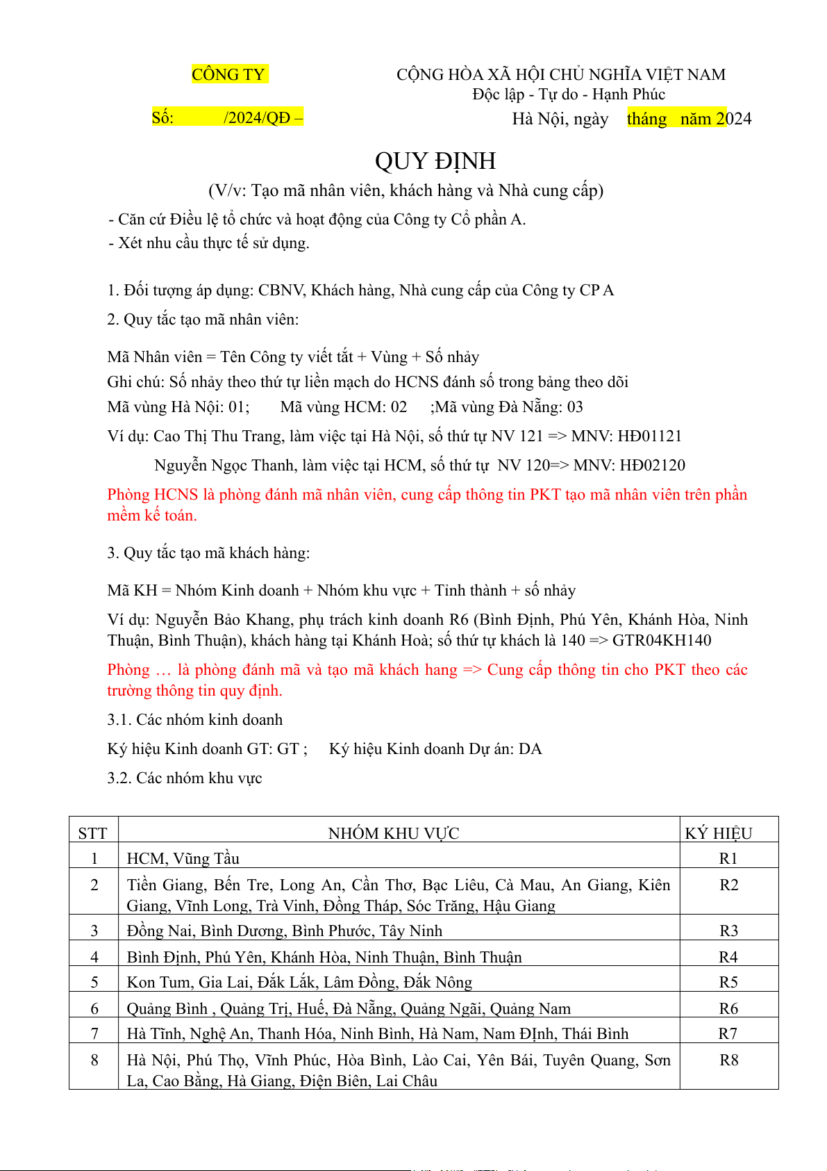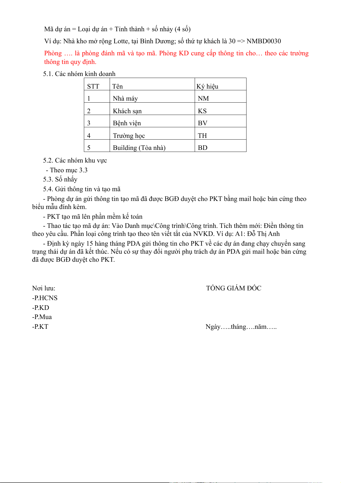 Phòng …. là phòng đánh mã và tạo mã. Phòng KD cung cấp thông tin cho… theo các trường thông tin quy định. 5.1. Các nhóm kinh doanh STT Tên Ký hiệu 1 Nhà máy NM 2 Khách sạn KS 3 Bệnh viện BV 4 Trường học TH 5 Building (Tòa nhà) BD 5.2. Các nhóm khu vực - Theo mục 3.3 5.3. Số nhẩy