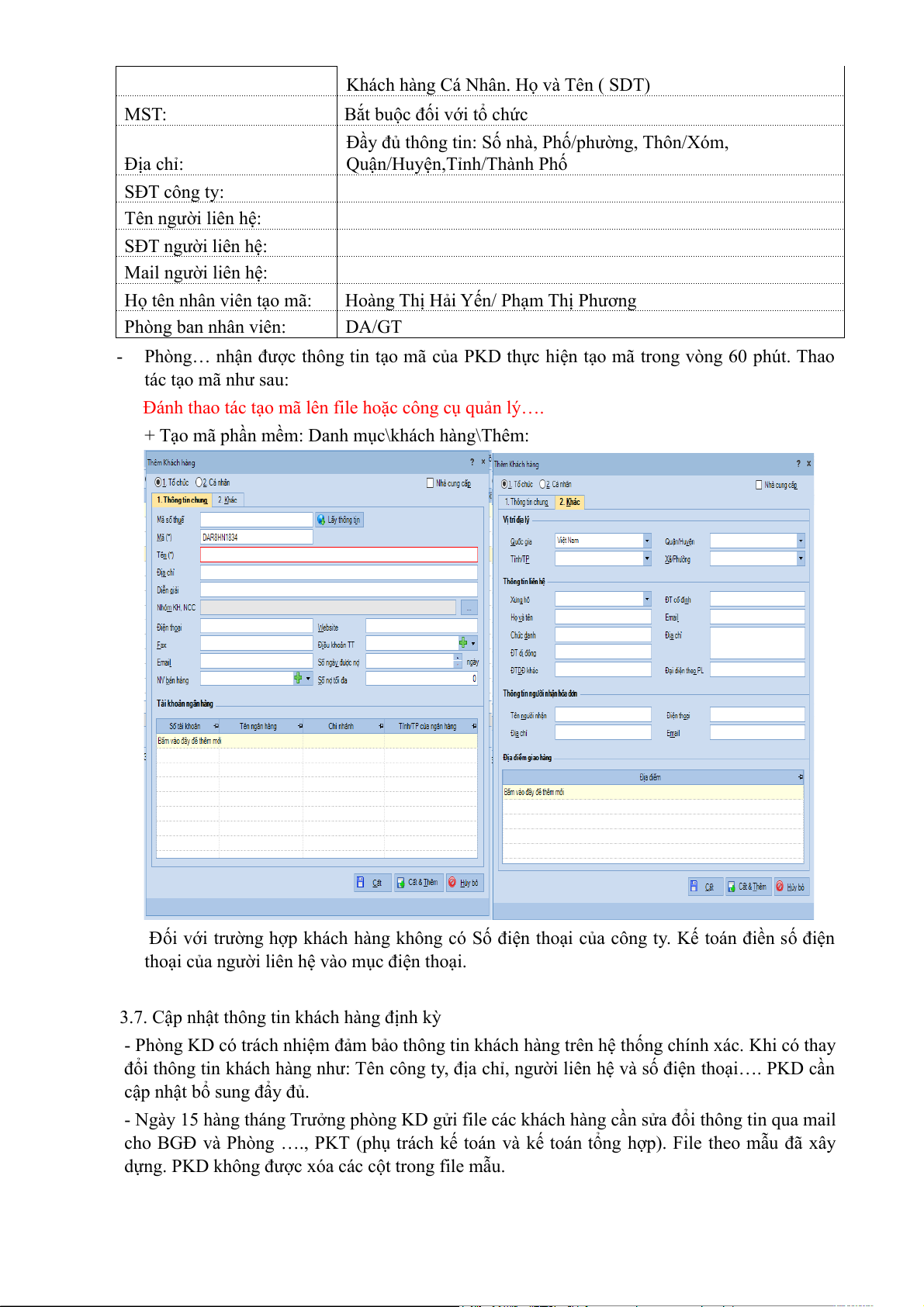 - Phòng KD có trách nhiệm đảm bảo thông tin khách hàng trên hệ thống chính xác. Khi có thay
