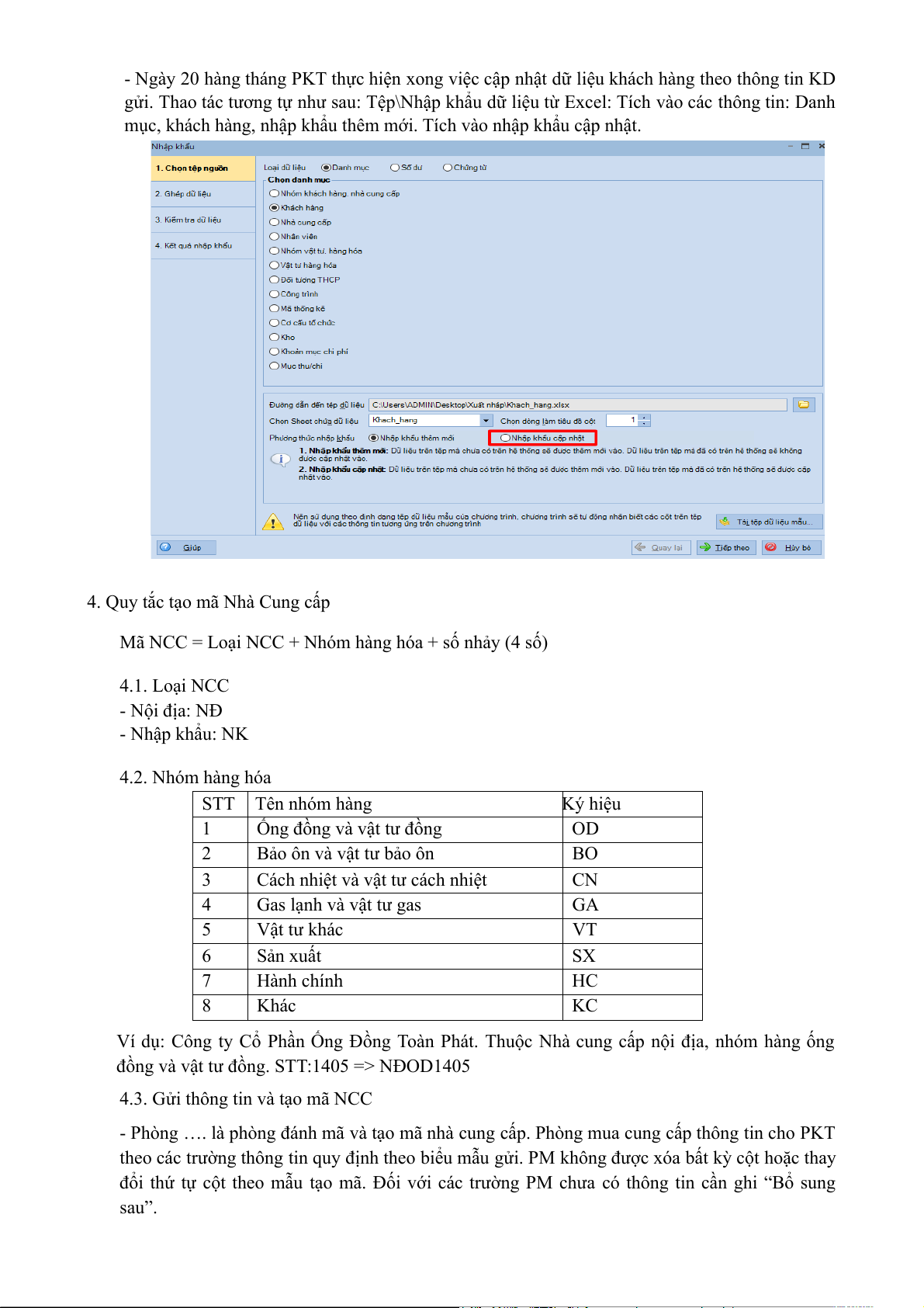 - Cập nhật bổ sung thông tin NCC : thao tác tương tự như tạo mã NCC, nhưng tích vào “Nhập khẩu cập nhật”. *) CHÚ Ý: