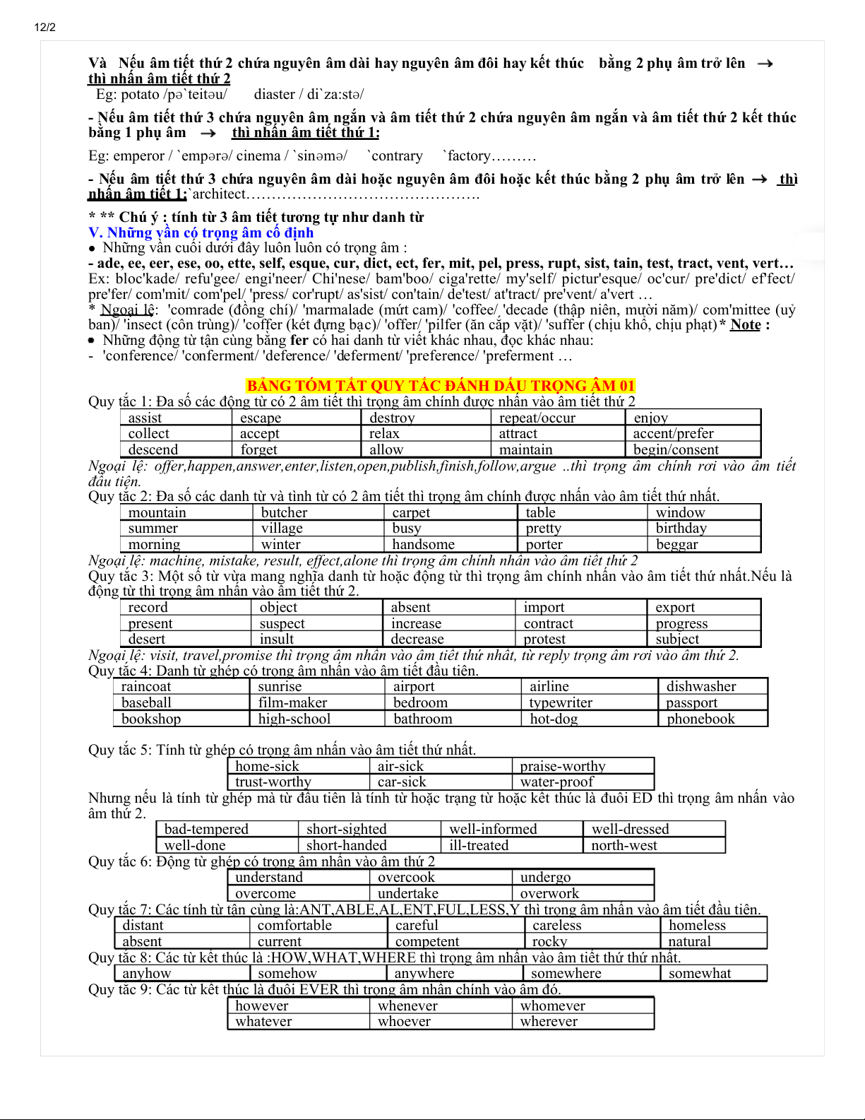 Ex: 'consolidate/ 'decorate/ cre'ate/ con'clude/ 'persecute/ 'simplify/ 'multiply/ ap'ply/ 'criticise/ 'compromise. * Ngoại lệ: