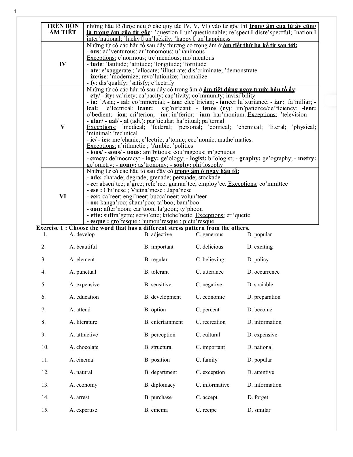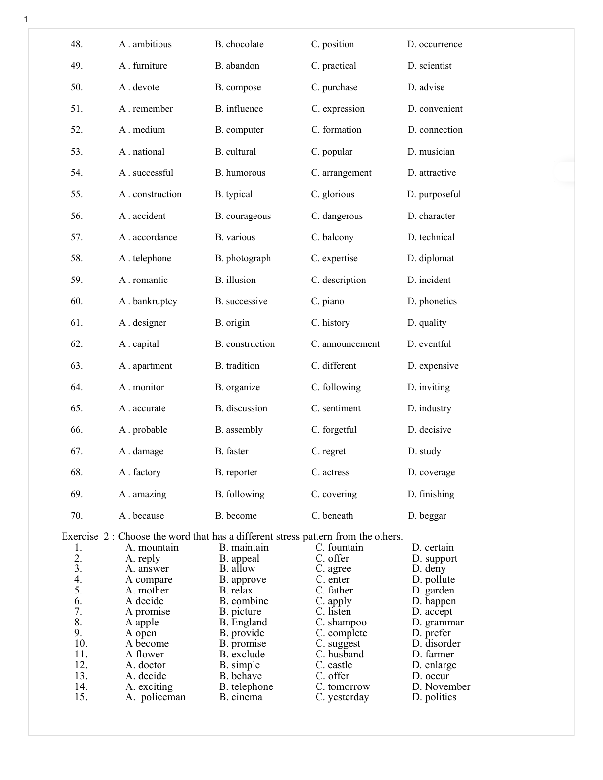 Exercise 1 : Choose the word that has a different stress pattern from the others. 1. A. develop B. adjective C. generous D. popular 2. A. beautiful B. important C. delicious D. exciting 3. A. element B. regular C. believing D. policy 4. A. punctual B. tolerant C. utterance D. occurrence 5. A. expensive B. sensitive C. negative D. sociable 6. A. education B. development C. economic D. preparation 7. A. attend B. option C. percent D. become 8. A. literature B. entertainment C. recreation D. information 9. A. attractive B. perception C. cultural D. expensive 10. A. chocolate B. structural C. important D. national 11. A. cinema B. position C. family D. popular 12. A. natural B. department C. exception D. attentive 13. A. economy B. diplomacy C. informative D. information 14. A. arrest B. purchase C. accept D. forget 15. A. expertise B. cinema C. recipe D. similar