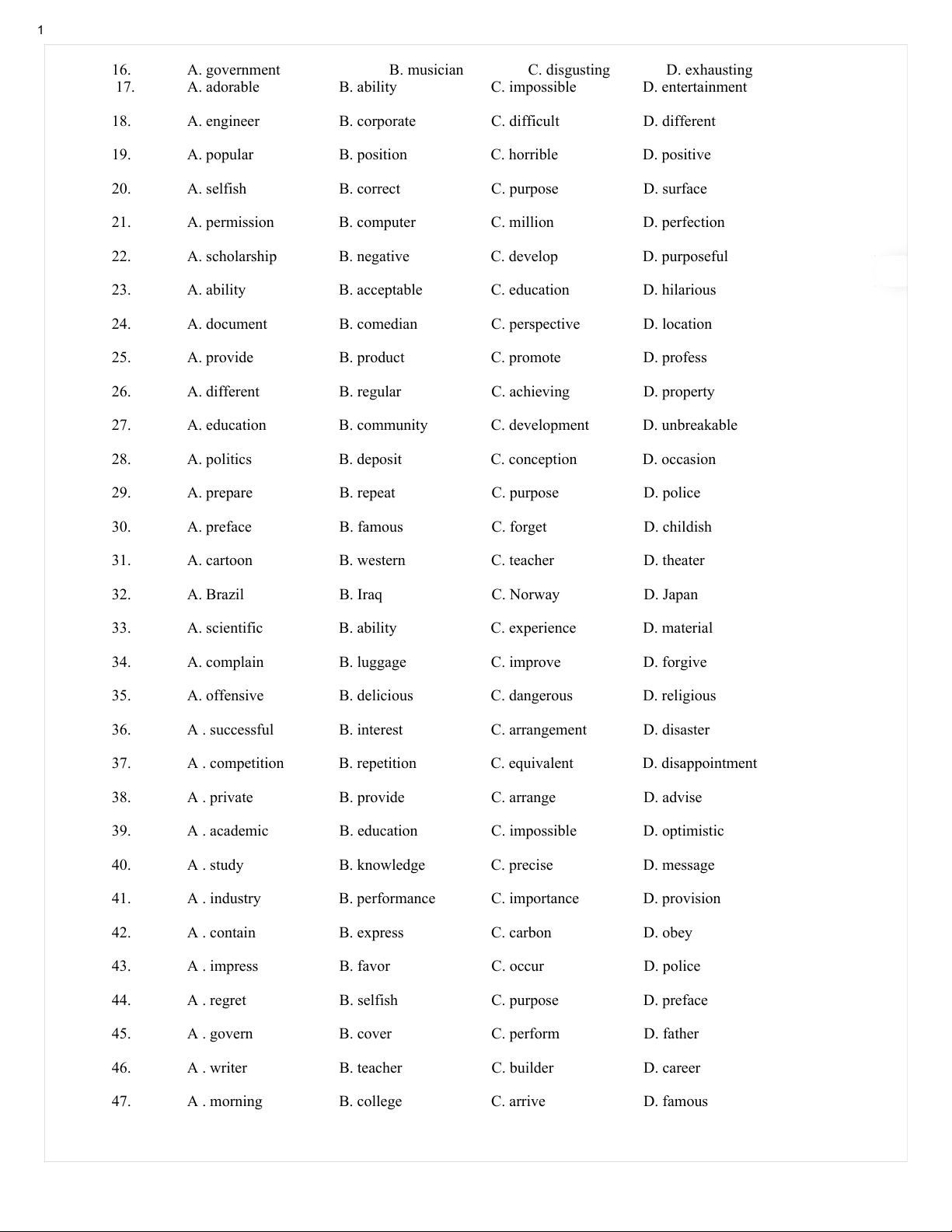 https://www.scribd.com/embeds/679700071/content 5/9 12/23/25, 5:18 PM Scribd 16. A. government B. musician C. disgusting D. exhausting 17. A. adorable B. ability C. impossible D. entertainment 18. A. engineer B. corporate C. difficult D. different 19. A. popular B. position C. horrible D. positive 20. A. selfish B. correct C. purpose D. surface 21. A. permission B. computer C. million D. perfection 22. A. scholarship B. negative C. develop D. purposeful 23. A. ability B. acceptable C. education D. hilarious 24. A. document B. comedian C. perspective D. location 25. A. provide B. product C. promote D. profess 26. A. different B. regular C. achieving D. property 27. A. education B. community C. development D. unbreakable 28. A. politics B. deposit C. conception D. occasion 29. A. prepare B. repeat C. purpose D. police 30. A. preface B. famous C. forget D. childish 31. A. cartoon B. western C. teacher D. theater 32. A. Brazil B. Iraq C. Norway D. Japan 33. A. scientific B. ability C. experience D. material 34. A. complain B. luggage C. improve D. forgive 35. A. offensive B. delicious C. dangerous D. religious 36. A . successful B. interest C. arrangement D. disaster 37. A . competition B. repetition C. equivalent D. disappointment 38. A . private B. provide C. arrange D. advise 39. A . academic B. education C. impossible D. optimistic 40. A . study B. knowledge C. precise D. message 41. A . industry B. performance C. importance D. provision 42. A . contain B. express C. carbon D. obey 43. A . impress B. favor C. occur D. police 44. A . regret B. selfish C. purpose D. preface 45. A . govern B. cover C. perform D. father 46. A . writer B. teacher C. builder D. career 47. A . morning B. college C. arrive D. famous