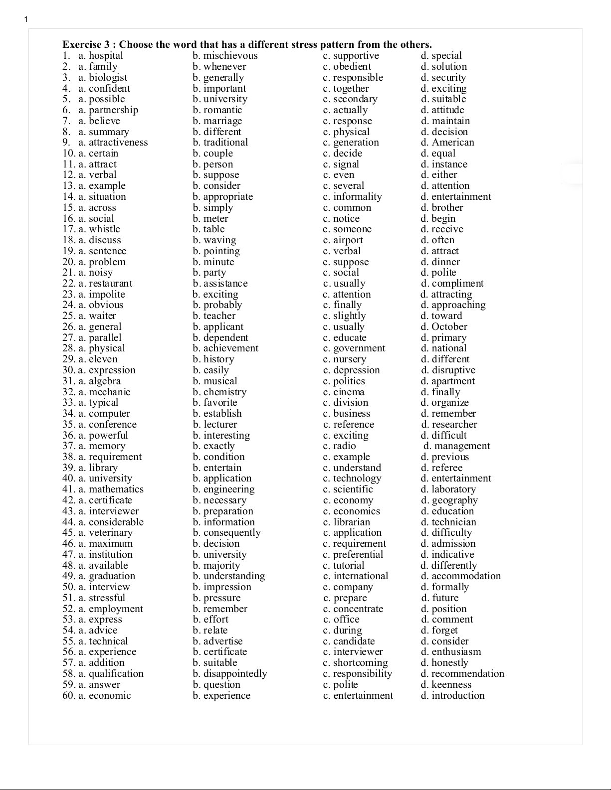 Exercise 3 : Choose the word that has a different stress pattern from the others. 1. a. hospital b. mischievous c. supportive d. special 2. a. family b. whenever c. obedient d. solution 3. a. biologist b. generally c. responsible d. security 4. a. confident b. important c. together d. exciting 5. a. possible b. university c. secondary d. suitable 6. a. partnership b. romantic c. actually d. attitude 7. a. believe b. marriage c. response d. maintain 8. a. summary b. different c. physical d. decision 9. a. attractiveness b. traditional c. generation d. American 10. a. certain b. couple c. decide d. equal 11. a. attract b. person c. signal d. instance 12. a. verbal b. suppose c. even d. either 13. a. example b. consider c. several d. attention 14. a. situation b. appropriate c. informality d. entertainment 15. a. across b. simply c. common d. brother 16. a. social b. meter c. notice d. begin 17. a. whistle b. table c. someone d. receive 18. a. discuss b. waving c. airport d. often 19. a. sentence b. pointing c. verbal d. attract 20. a. problem b. minute c. suppose d. dinner 21. a. noisy b. party c. social d. polite 22. a. restaurant b. assistance c. usually d. compliment 23. a. impolite b. exciting c. attention d. attracting 24. a. obvious b. probably c. finally d. approaching 25. a. waiter b. teacher c. slightly d. toward 26. a. general b. applicant c. usually d. October 27. a. parallel b. dependent c. educate d. primary 28. a. physical b. achievement c. government d. national 29. a. eleven b. history c. nursery d. different 30. a. expression b. easily c. depression d. disruptive 31. a. algebra b. musical c. politics d. apartment 32. a. mechanic b. chemistry c. cinema d. final y 33. a. typical b. favorite c. division d. organize 34. a. computer b. establish c. business d. remember 35. a. conference b. lecturer c. reference d. researcher 36. a. powerful b. interesting c. exciting d. difficult 37. a. memory b. exactly c. radio d. management 38. a. requirement b. condition c. example d. previous 39. a. library b. entertain c. understand d. referee 40. a. university b. application c. technology d. entertainment 41. a. mathematics b. engineering c. scientific d. laboratory 42. a. certificate b. necessary c. economy d. geography 43. a. interviewer b. preparation c. economics d. education 44. a. considerable b. information c. librarian d. technician 45. a. veterinary b. consequently c. application d. difficulty 46. a. maximum b. decision c. requirement d. admission 47. a. institution b. university c. preferential d. indicative 48. a. available b. majority c. tutorial d. differently 49. a. graduation b. understanding c. international d. accommodation 50. a. interview b. impression c. company d. formally 51. a. stressful b. pressure c. prepare d. future 52. a. employment b. remember c. concentrate d. position 53. a. express b. effort c. office d. comment 54. a. advice b. relate c. during d. forget 55. a. technical b. advertise c. candidate d. consider 56. a. experience b. certificate c. interviewer d. enthusiasm 57. a. addition b. suitable c. shortcoming d. honestly 58. a. qualification b. disappointedly c. responsibility d. recommendation 59. a. answer b. question c. polite d. keenness 60. a. economic b. experience c. entertainment d. introduction