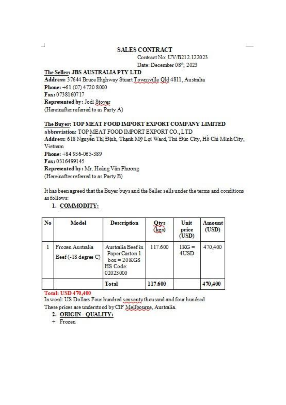 1.1 Thông tin chung về lô hàng nhập khẩu   STT  Hạng mục  Thông tin chung  1  Nhà xuất khẩu  Tên công ty: Jbs  Australia Pty Ltd  Địa chỉ: 37644 Bruce  Highway Stuart  Mã số thuế:  0738160717  Liên hệ: 0747208000  2  Nhà nhập khẩu  Tên công ty: Top Meat  Food Import Export  Co,.Ltd  Địa chỉ: 606-618  Nguyễn Thị Định,  Phường Thạnh Mỹ  Lợi, Thủ Đức, Việt  Nam  Mã  số  thuế:  0316499145  Liên hệ: 0936065389  3